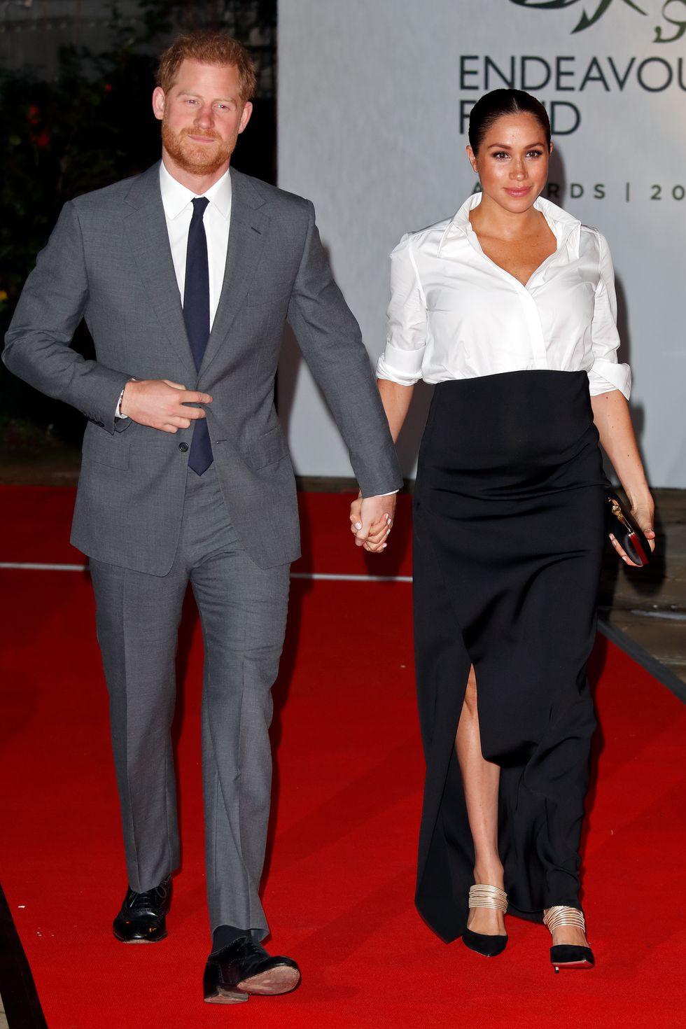 lOOK11:纪梵希(Givenchy)衬衫套装2019年2月7日,哈里王子和梅根连续第二年参加了奋进基金的颁奖典礼。苏塞克斯公爵夫人身穿一套男装风格的短裙和衬衫套装,这件大作出自纪梵希(Givenchy)设计师克莱尔·维特·凯勒(Clare Waight Keller)之手。脚上再搭配一双金色的Aquazzura高跟鞋,让造型更加协调,手里拿着是纪梵希(Givenchy)手包。