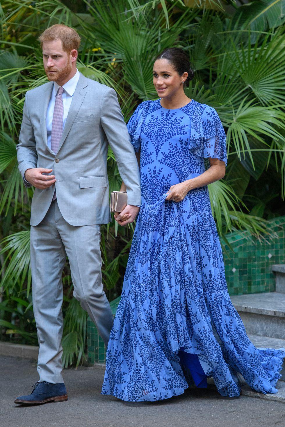 look6:Carolina Herrera定制连衣裙2019年2月25日,这对皇室夫妇在摩洛哥访问期间会见了摩洛哥国王穆罕默德六世。梅根身穿卡Carolina Herrera定制的飘逸蓝色连衣裙,手拿迪奥手包。