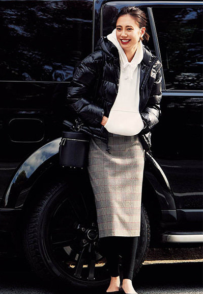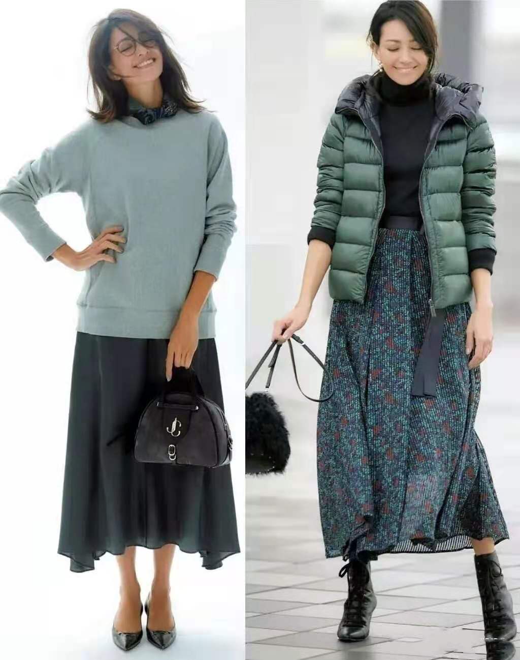 羽绒服+半身裙:厚重、短款、低调暗色印花、飘逸轻柔,当这些关键词组合在一起,就是对冬天的时尚敬礼。记得要同色系哦,让美感放大。