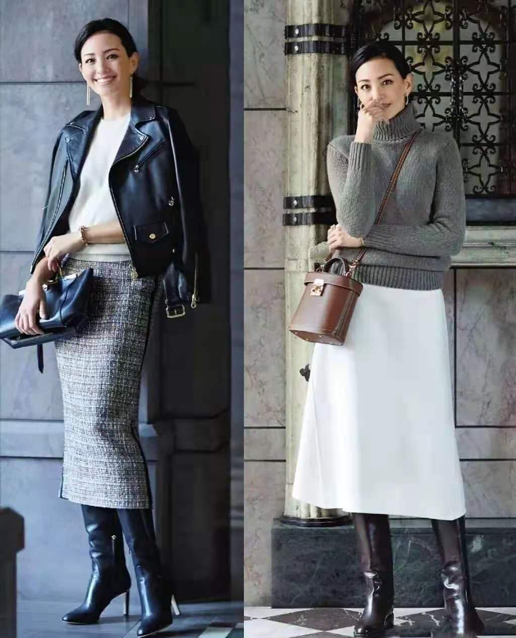 除了皮衣,温柔的大毛衣配半身裙,再用长筒靴强化,大气美跃然眼前。