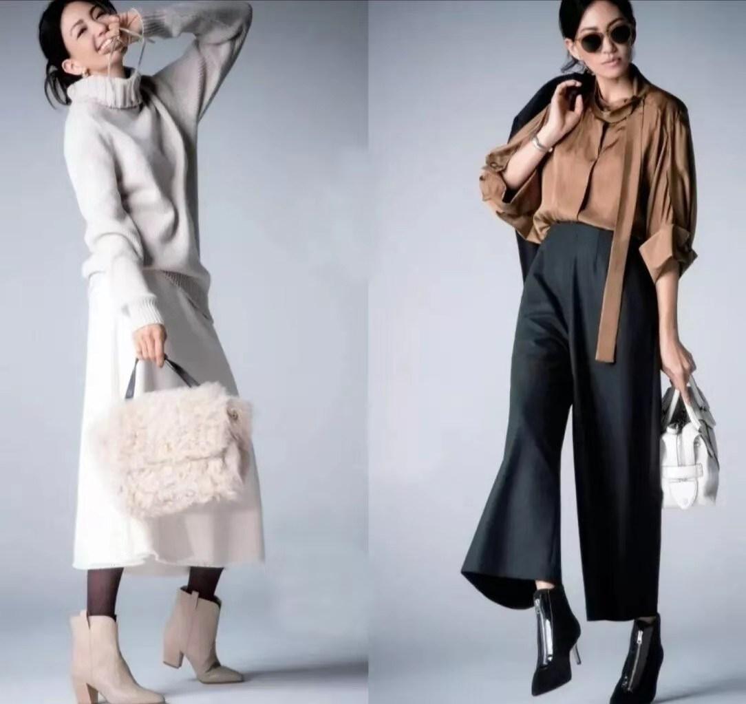阔腿西裤+高跟短靴:阔腿裤的美,在于风度与修饰。掩盖一切粗壮下半身,增添几分潇洒风骨。尖头、细高跟,性感温柔专属,用在阔腿裤的中性中,格外协调。