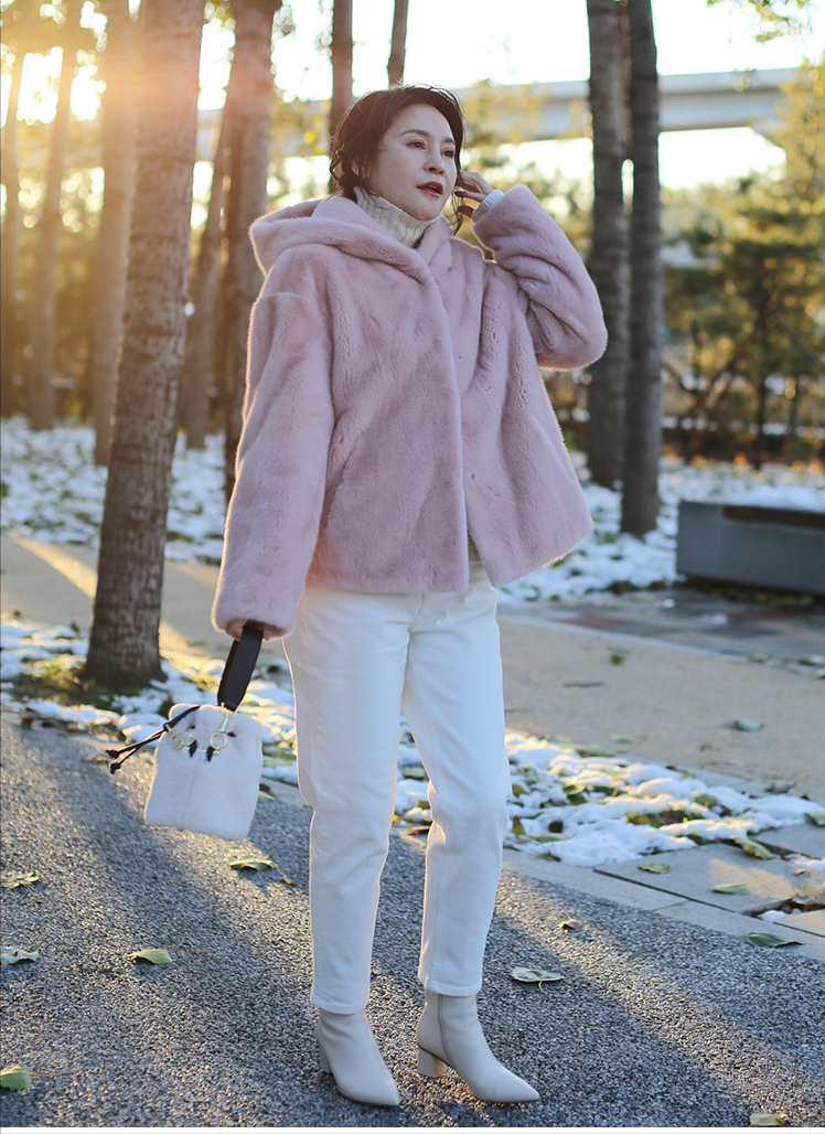 比如三妈的穿搭,粉色羊羔绒外套搭配白色牛仔裤,配上米色的靴子呼应白色和粉色,色系搭配延续浅色+浅色,也就是选择同色系的穿搭,视觉上会显得更加和谐。
