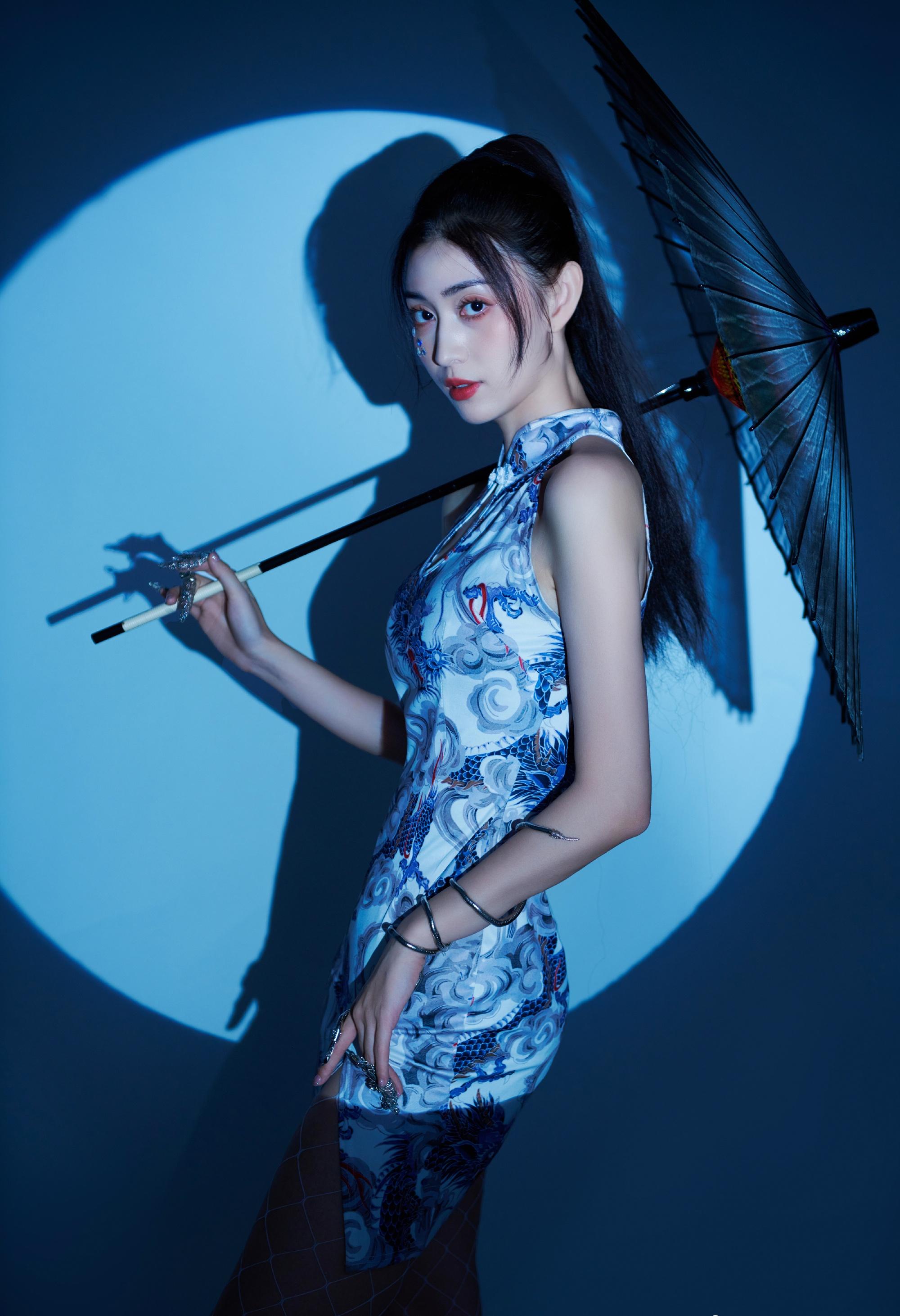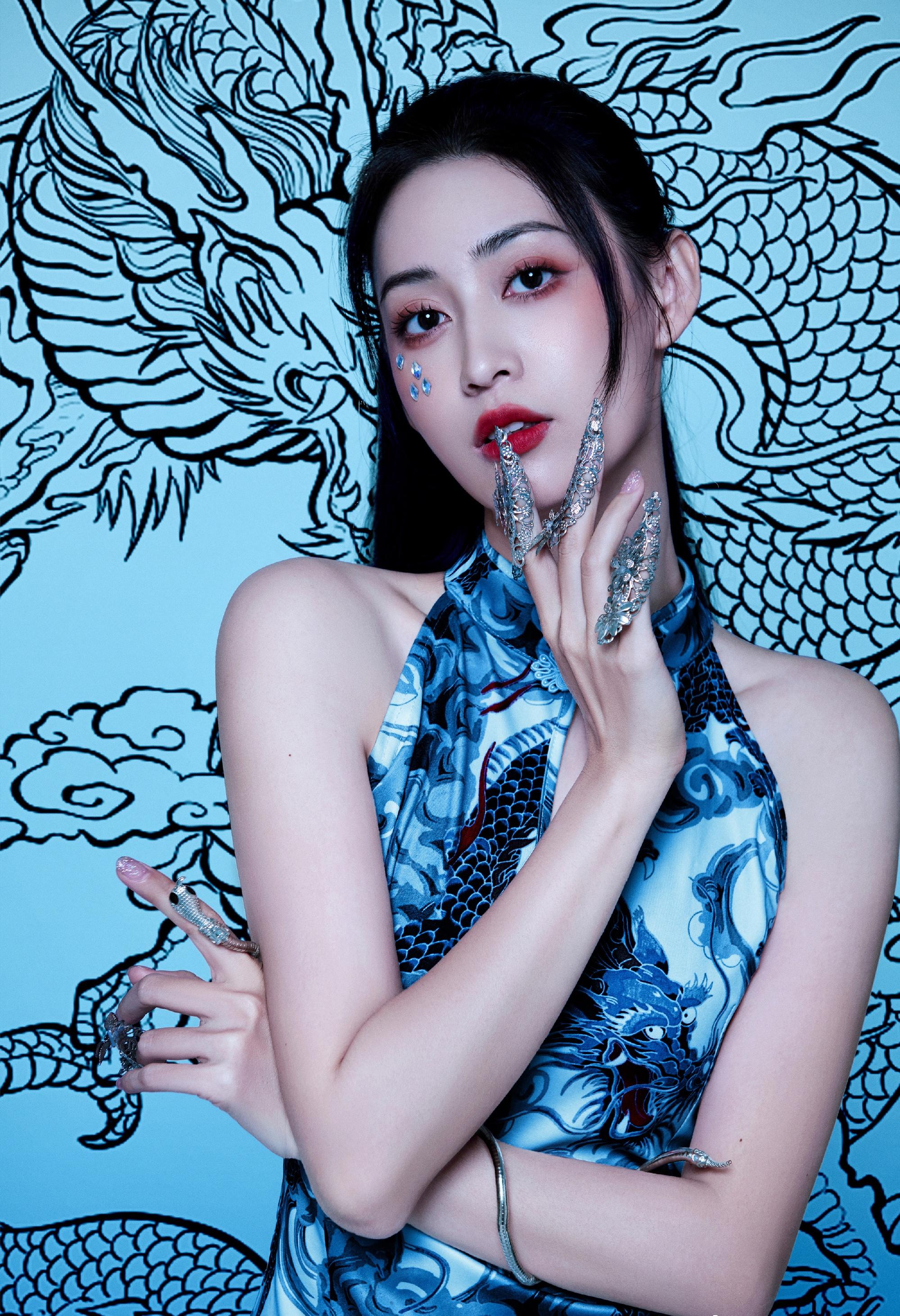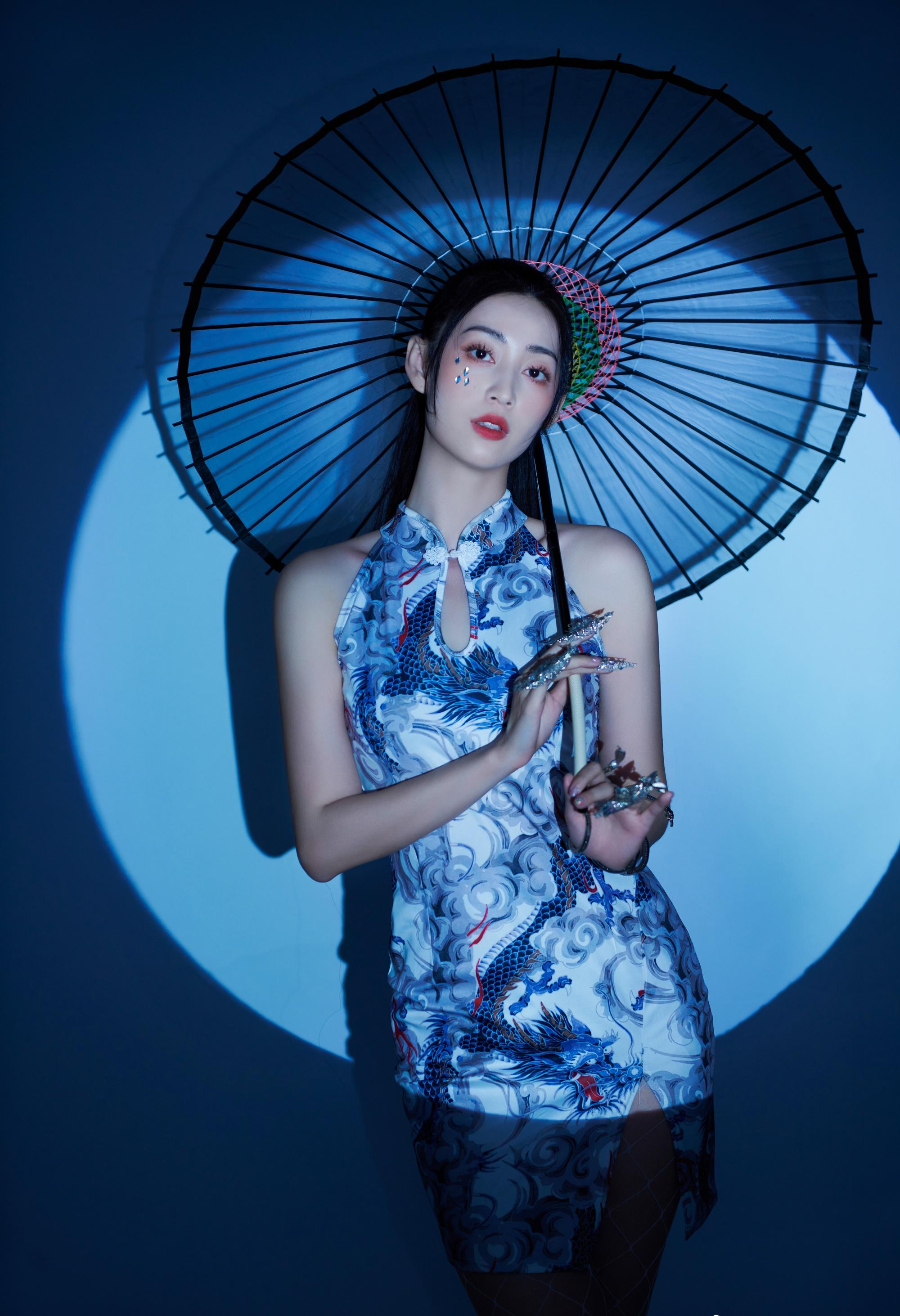 我们看到,在谭乔伊的这组写真中,她身穿有水墨画的新潮旗袍,头发梳起,长发披肩,脚穿白色的松糕鞋。眼袋下贴着青色饰物,手指上也戴着饰物指甲。