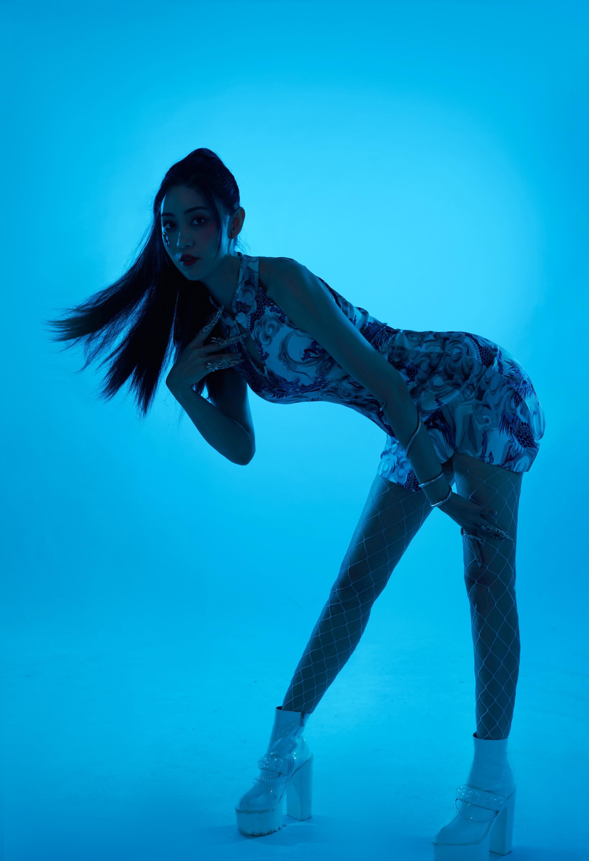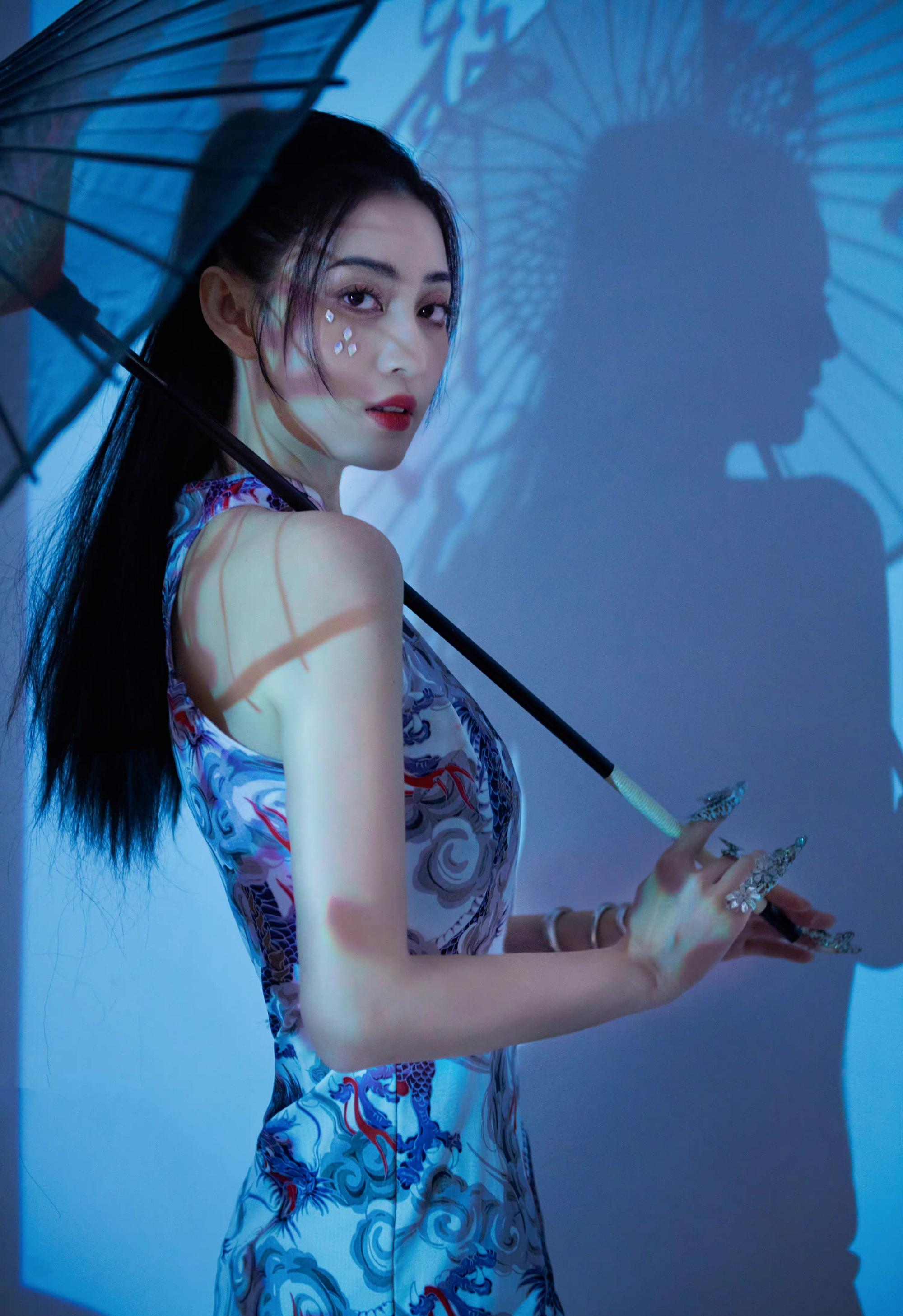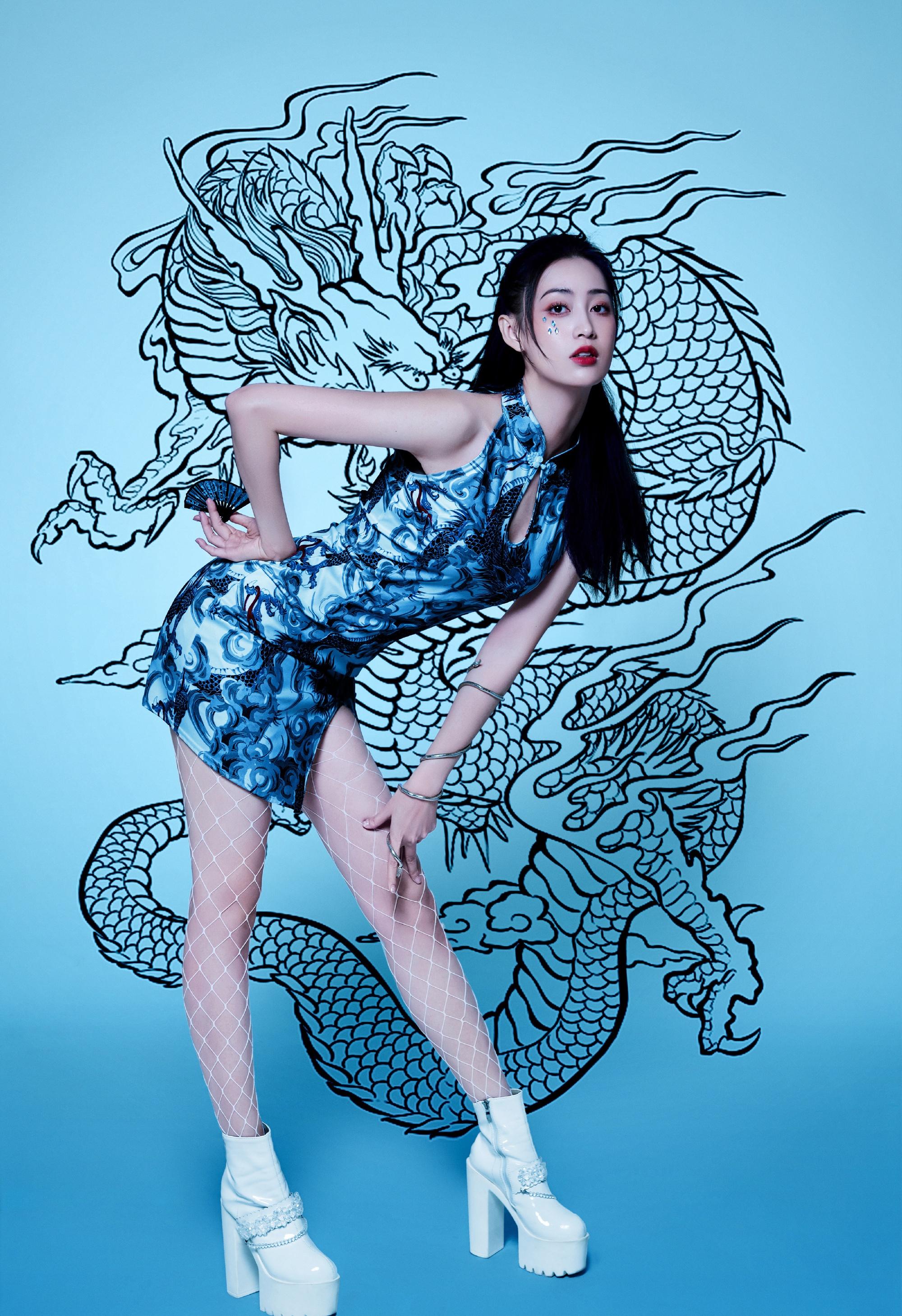 我们看到,在谭乔伊的这组写真中,她身穿有水墨画的新潮旗袍,头发梳起,长发披肩,脚穿白色的松糕鞋。眼袋下贴着青色饰物,手指上也戴着饰物指甲。