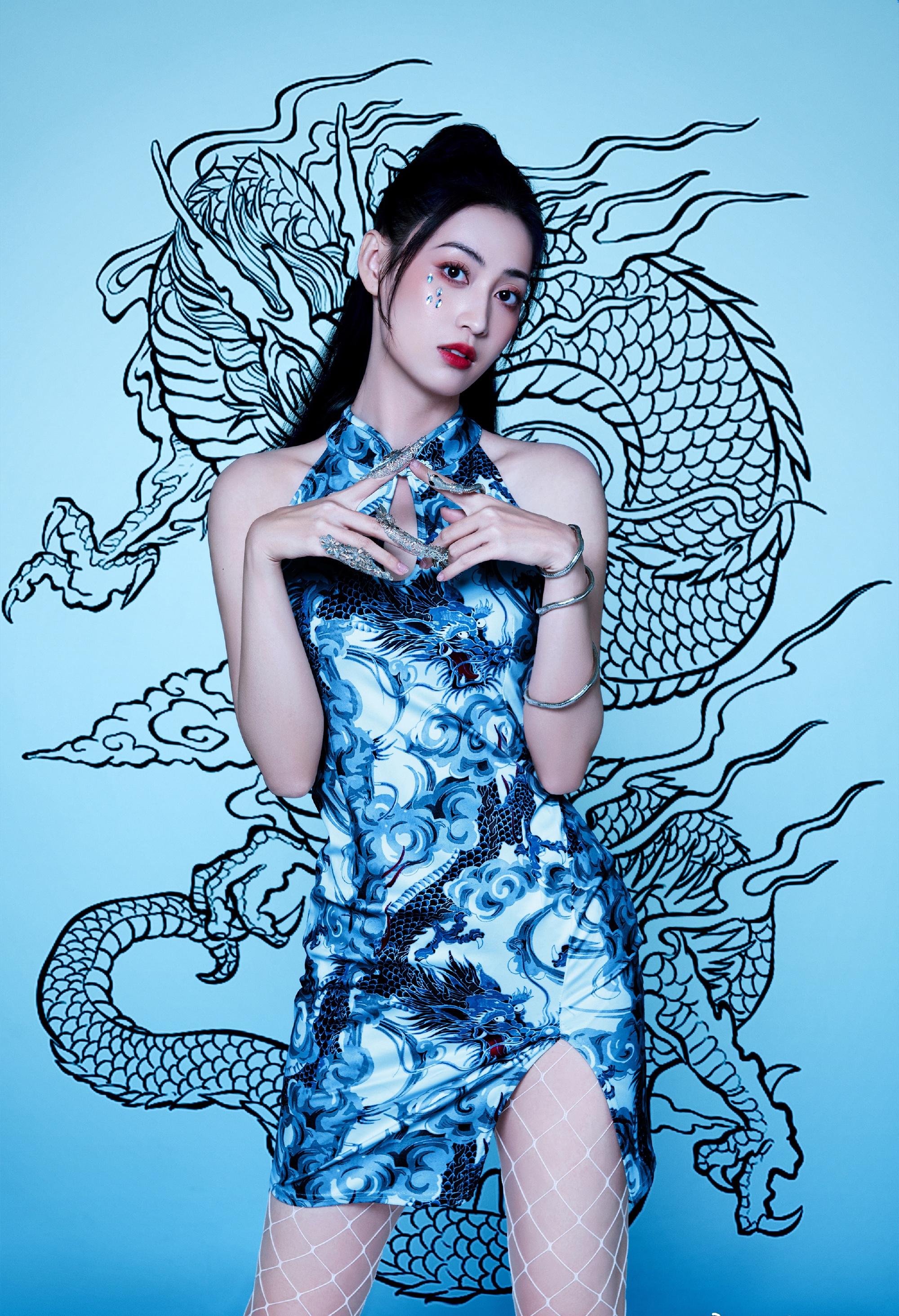 这几张是谭乔伊的正面写真。她身后有龙纹和书法墙,中国风味道浓郁。