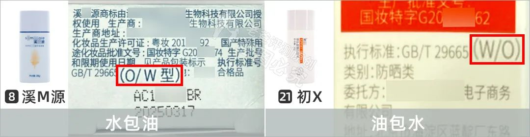 这里还有个小知识点:国产品牌防晒霜包装上可以找到执行标准:GB/T 29665,注意看后面括号里的字母。如果是(O/W)则为水包油型,反之,(W/O)则为油包水型。