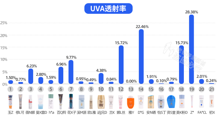 并使用紫外照度计测得每款样品的 UVA 透射率——
