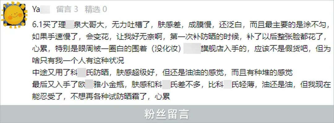 二、防晒力和肤感只能二选一?我们在征集时,看到了这样的留言:某品牌防晒霜成膜慢、泛白还涂不匀,让人心累
