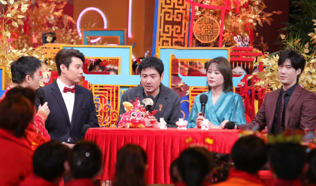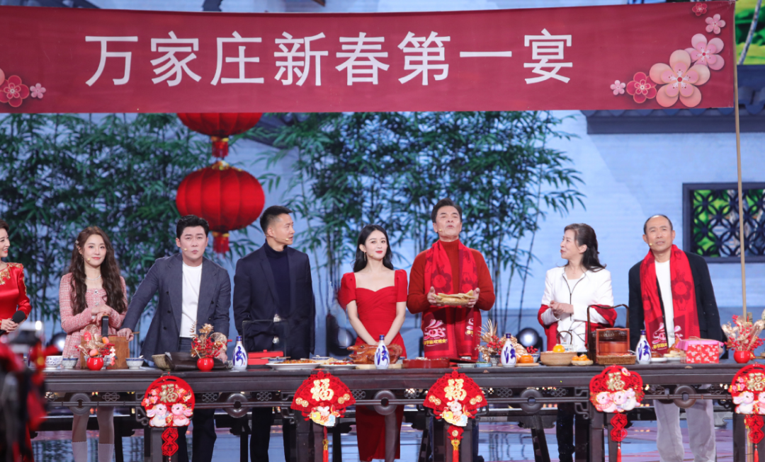 赵丽颖的节目看起来是剧组《幸福到万家》的一次大团建。剧组主演除了罗晋之外基本都到了现场。赵丽颖和“万书记”站在中间,上面拉着横幅写着“万家庄新春第一宴”。