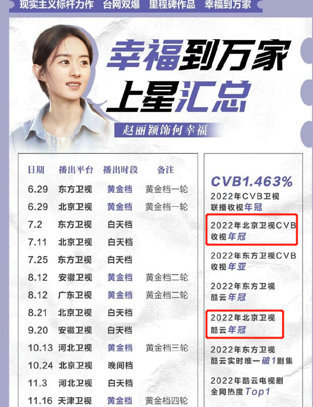 据悉,2022年《幸福到万家》拿下了北京卫视CVB和酷云的收视年冠,怪不得今年要请赵丽颖来当代言人,妥妥的凭实力换来的。
