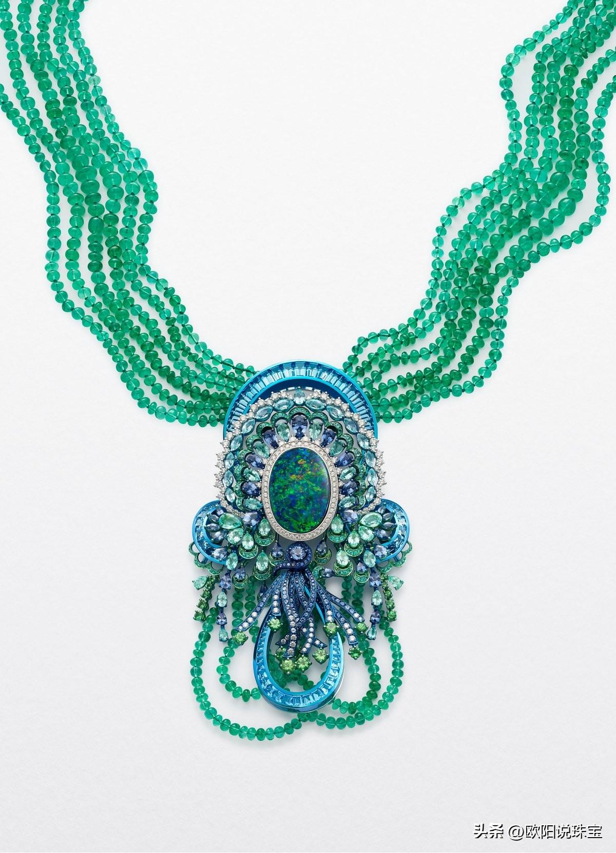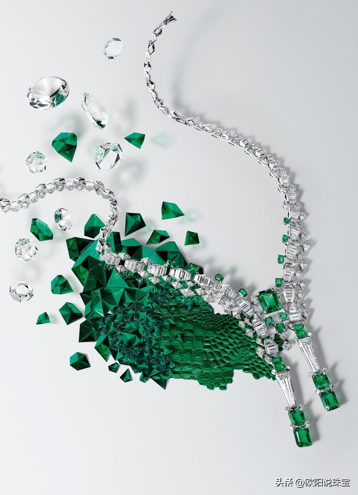 梵克雅宝本季,Van Cleef & Arpels 重新审视其传奇历史和过去的标志性作品。长期以来,这家巴黎时装屋在其设计中融入了重要的祖母绿和钻石,本季的艺术作品与其中一些具标志性的作品相呼应。Merveille d' émeraudes 项链意为“祖母绿的奇迹”,灵感来自 1929 年的一件作品, 后来被埃及的法伊莎公主收购. 这条新项链采用五颗梨形哥伦比亚祖母绿,总重达 70.40 克拉,周围环绕着圆形、长方形和三角形切割钻石。
