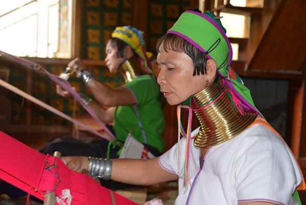 桥的对面是缅甸布岛族山庄,据了解,全世界仅存布岛族200余人。布岛族又被称作“长颈族”。在布岛山庄里,几个缅甸布岛族人在编制漂亮的围巾,看上去她们都有着长长的脖子,因为布岛族妇女视颈长为美,族中女孩5岁便在脖子上套上铜圈,10岁开始就每年在颈上多加一个,直到25岁身体定型为止。这些铜圈多时可达25个左右。随着社会的发展,布岛族的传统正在消失,想要前来一探奇观的小伙伴们可要抓紧时间了。