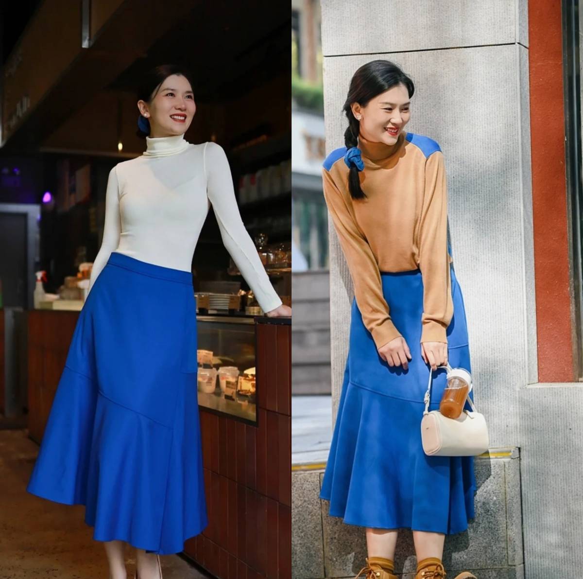 蓝色的半身裙一方面脱离了基础色的平淡感,另一方面,又不像艳丽色彩那样招摇且搭配起来很有难度,可以运用白色高领针织衫或者是驼色的上衣单品和宝蓝色的裙装结合,很有高级的氛围与优雅的韵味。