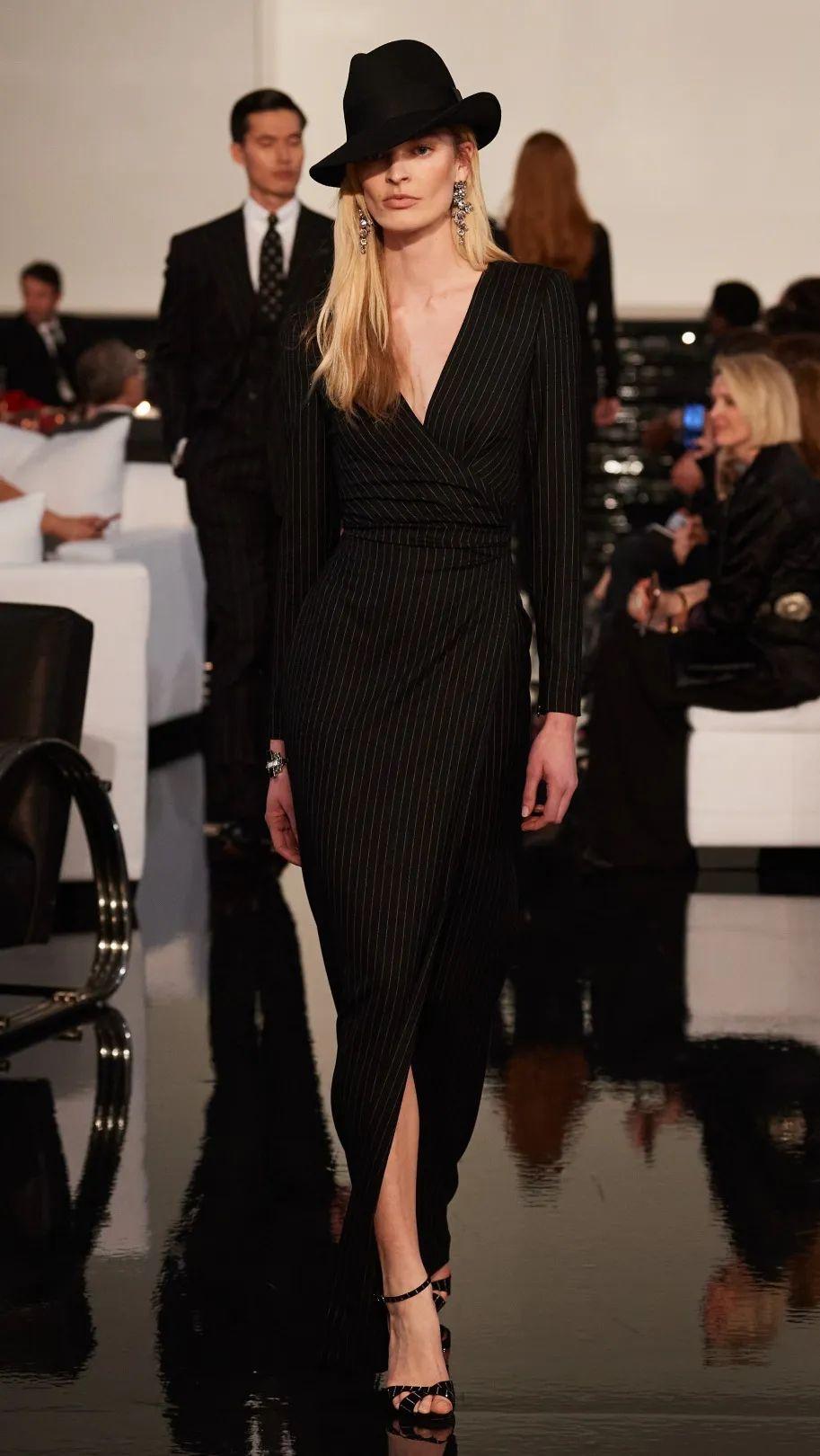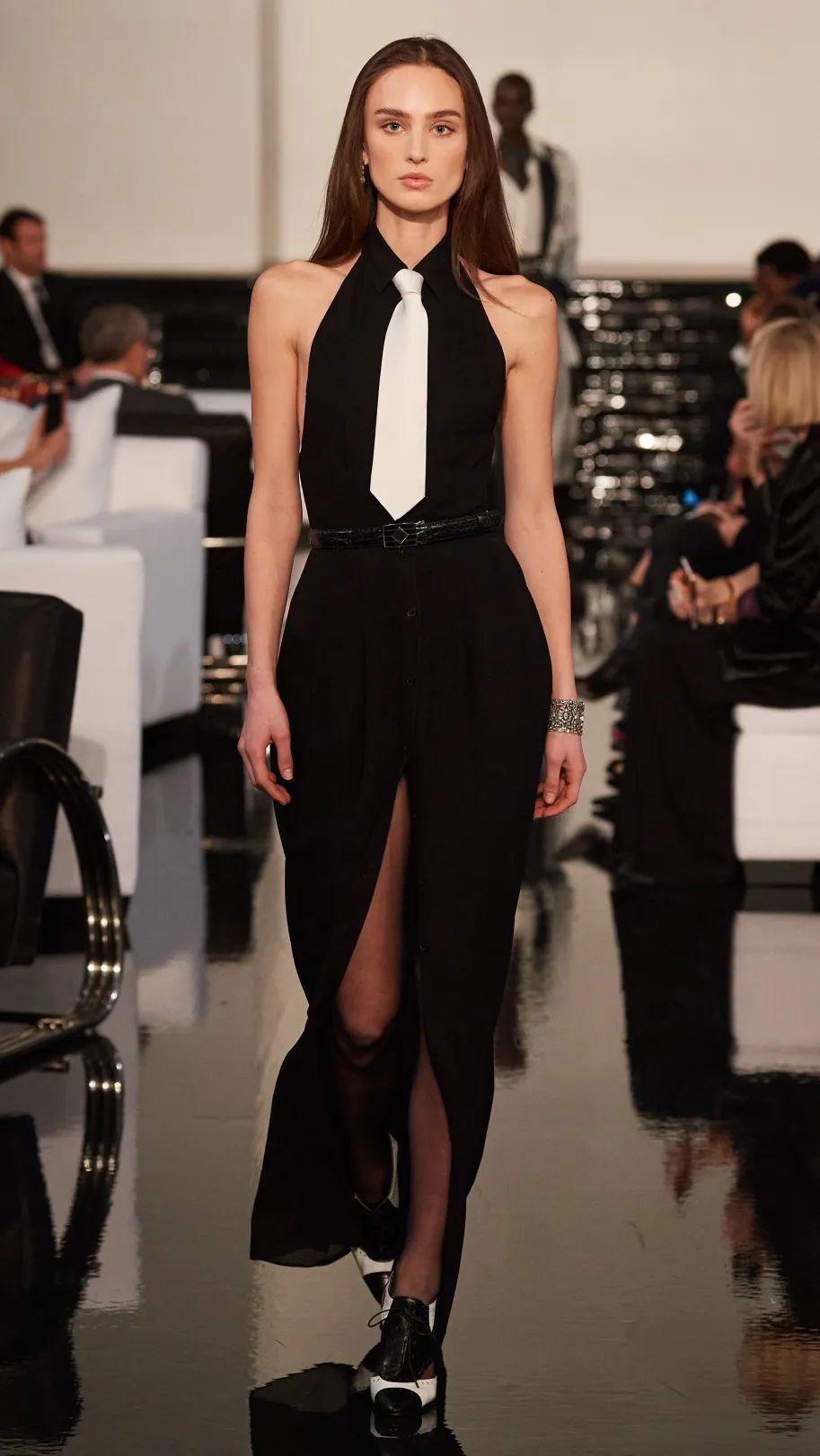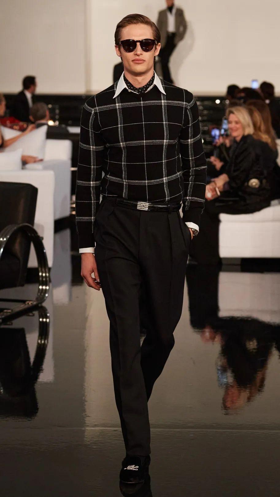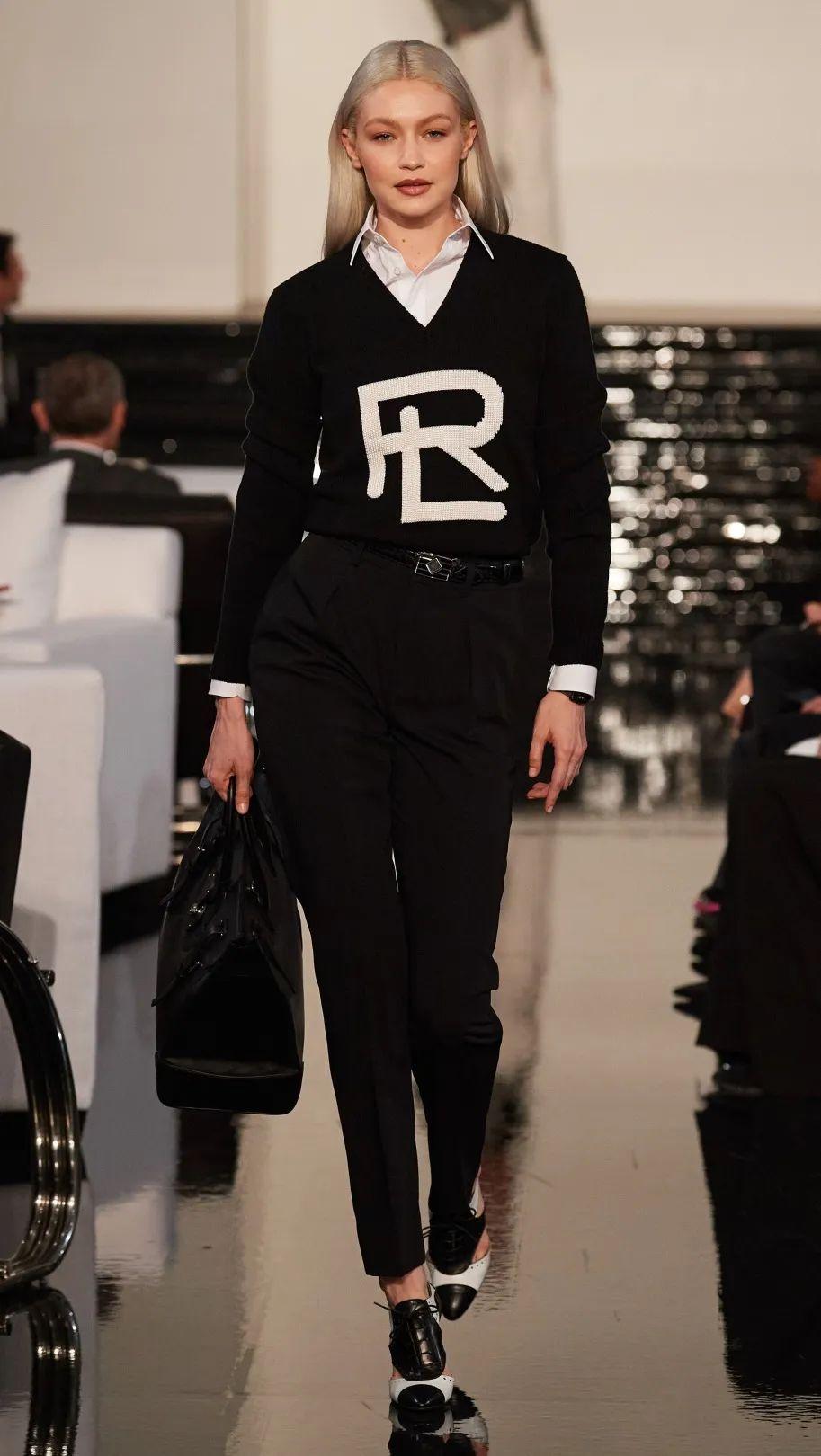 开场是印有Ralph Lauren Logo的针织衫,以及系列商务着装,如西装、衬衫、大衣等单品互相搭配,以黑白灰色彩着墨,诠释高端商务着装范本,飒酷有型。还有部分连衣裙款式,强调女性化的一面。