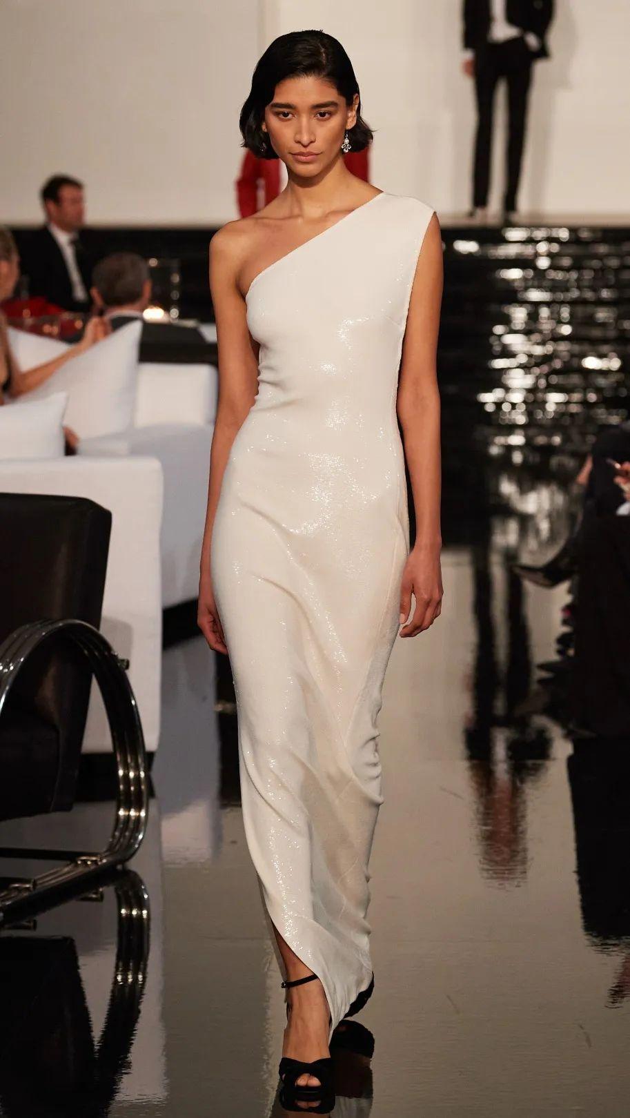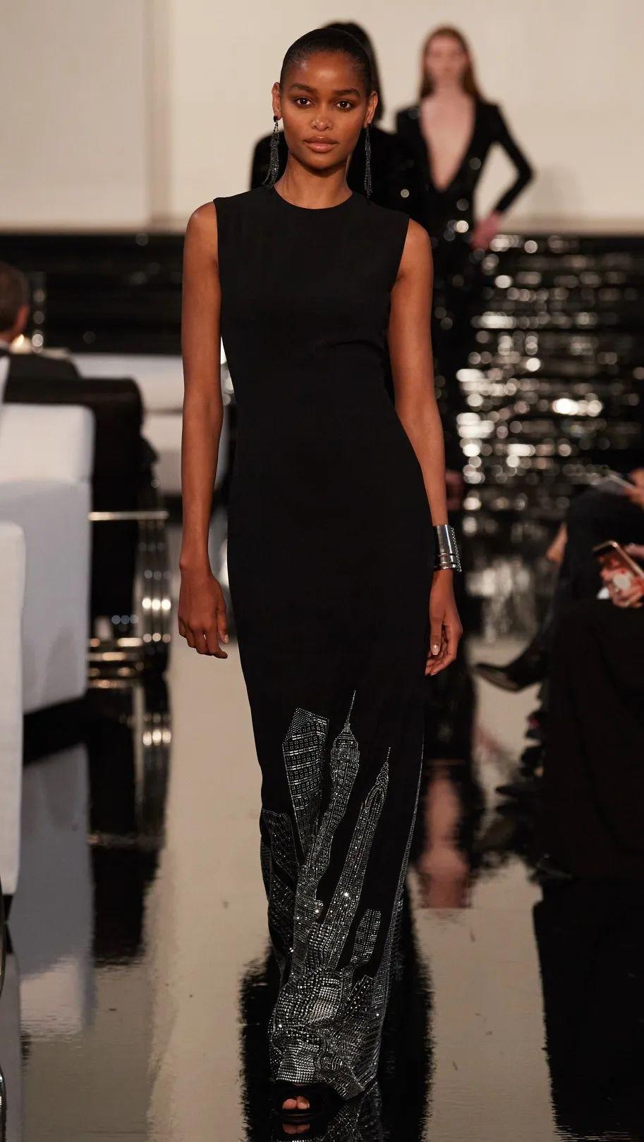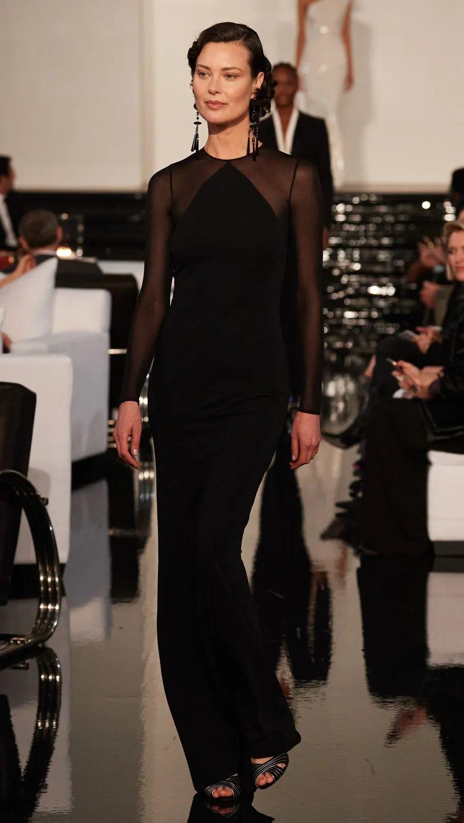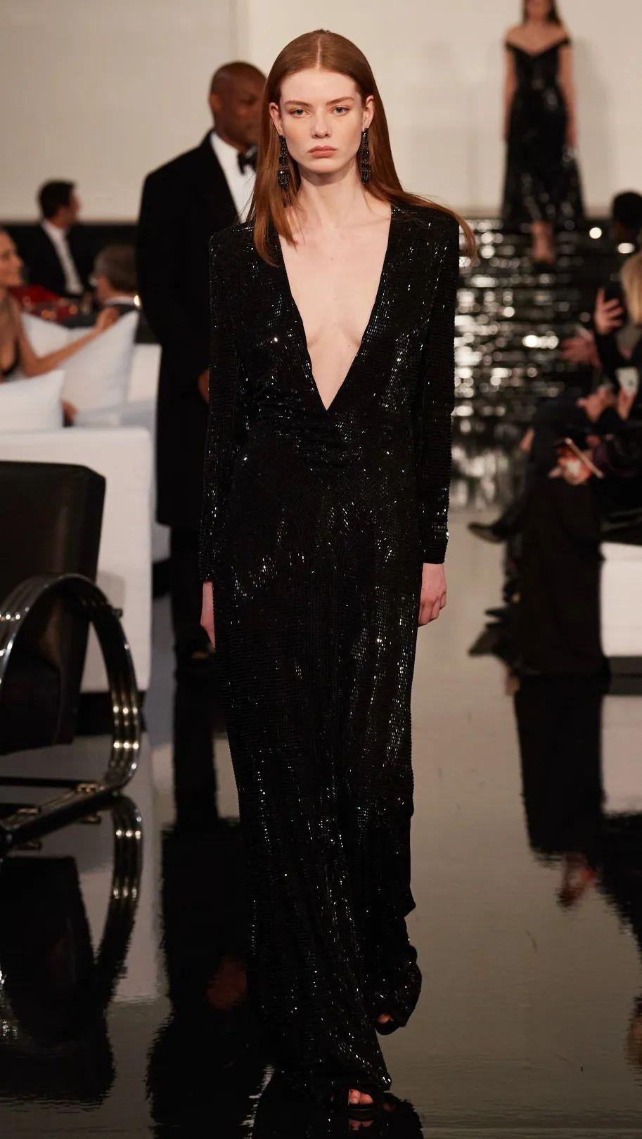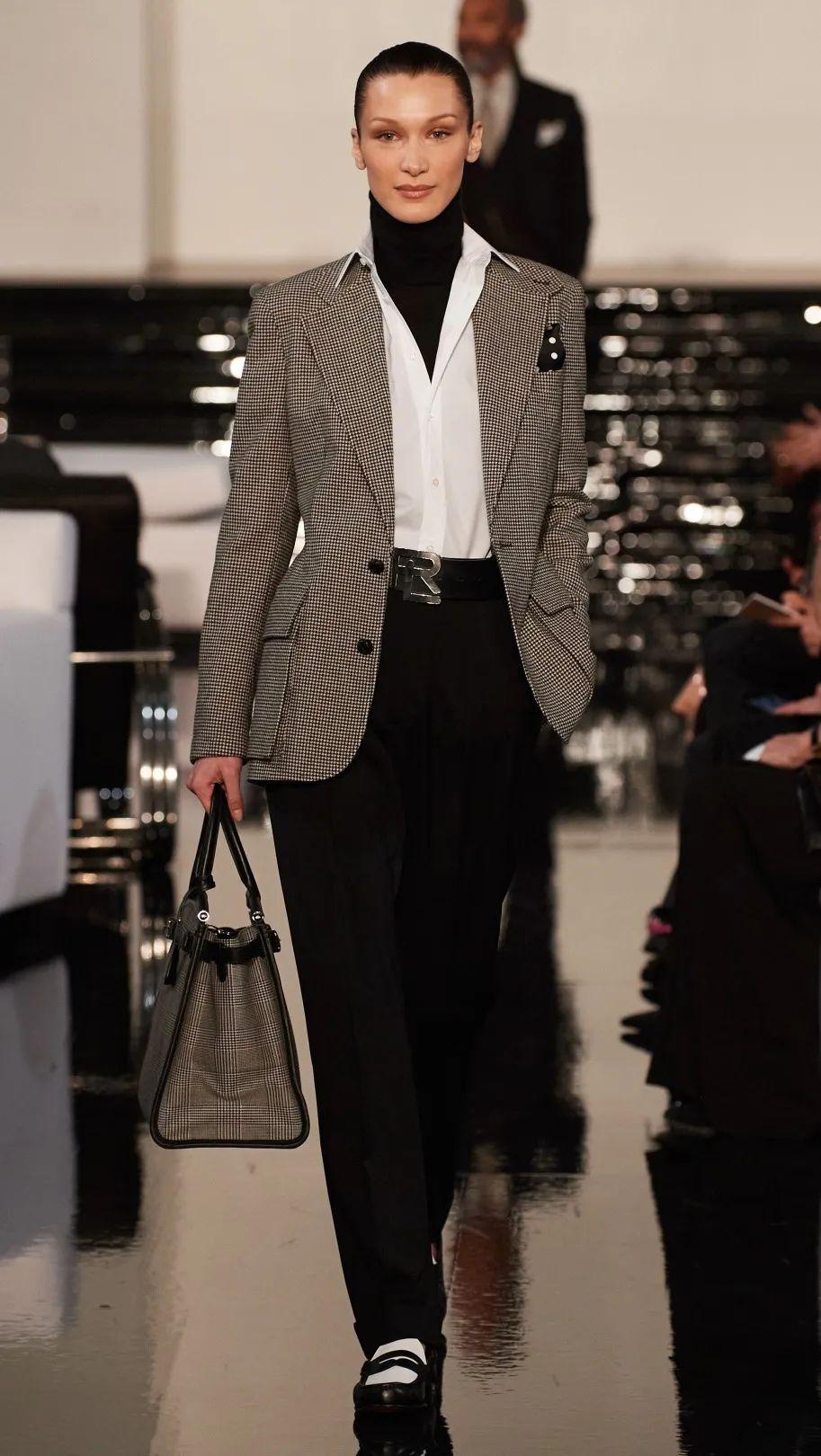 开场是印有Ralph Lauren Logo的针织衫,以及系列商务着装,如西装、衬衫、大衣等单品互相搭配,以黑白灰色彩着墨,诠释高端商务着装范本,飒酷有型。还有部分连衣裙款式,强调女性化的一面。