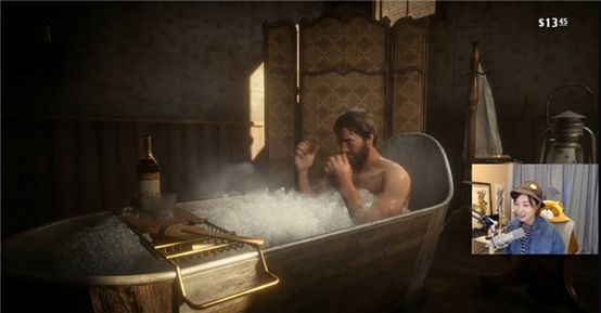 除了换衣系统,荒野大镖客2中还有一个让众玩家心动不已的大澡堂系统!作为一个好奇心很重的主播,女流自然也要去体验一番啦!不过,再交完钱看完主角泡完澡之后,弹幕水友纷纷表示很失望,看来R星对这款游戏的把控还是到位的。(手动滑稽)