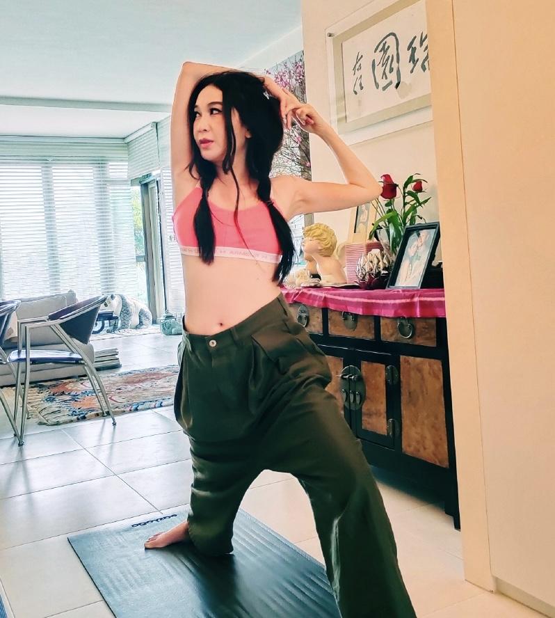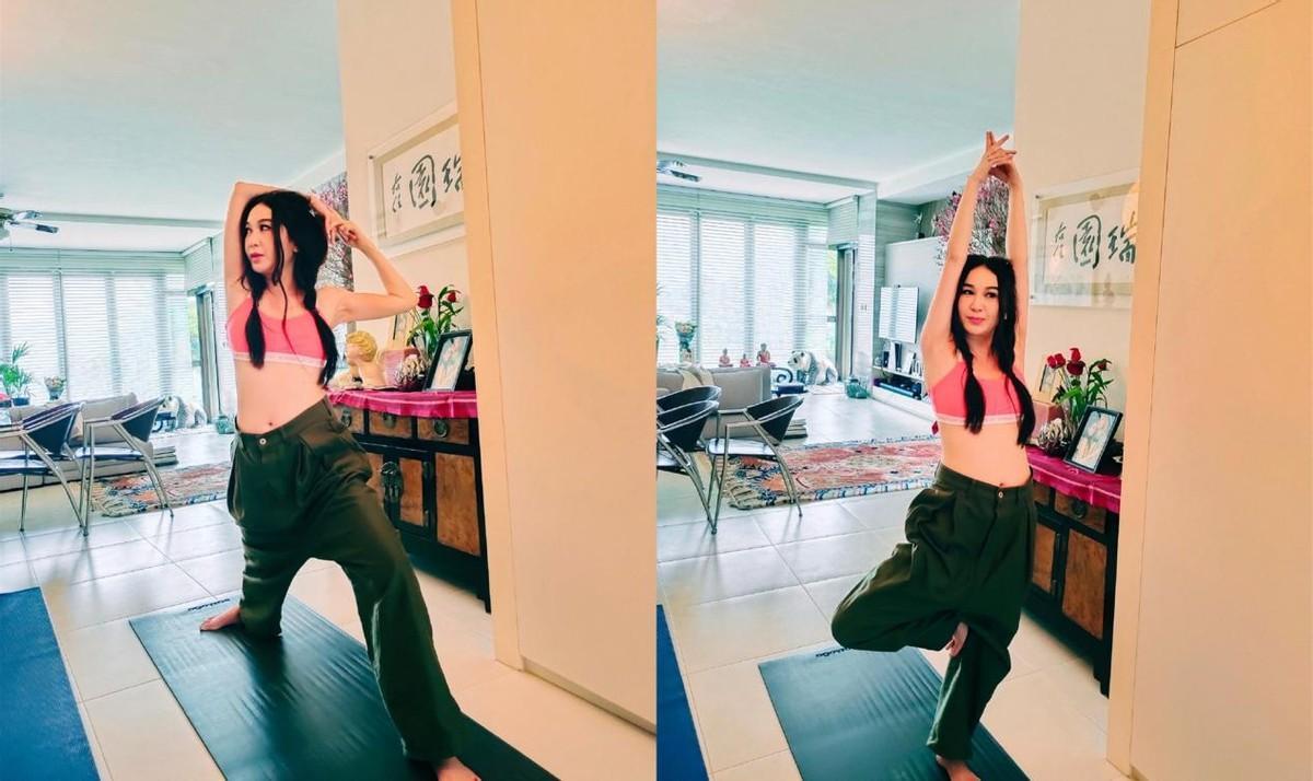 当天,温碧霞身穿浅粉色运动背心,搭配军绿色宽松休闲裤,一头长发扎成两个麻花辫搭在胸前,青春气息满满,脸上化着精致的妆容,皮肤十分白皙精致,短款运动背心露出一截小蛮腰,腰腹平坦光滑,在客厅里做着瑜伽动作,动作十分到位,双臂纤细修长,胳膊上的肌肉线条也是十分流畅优美的,整个人的状态很是在线,完全看不出是55岁的样子。
