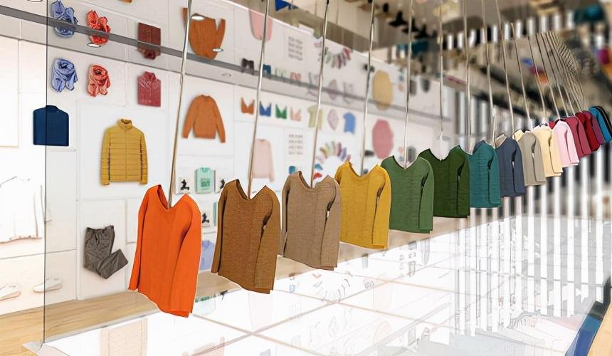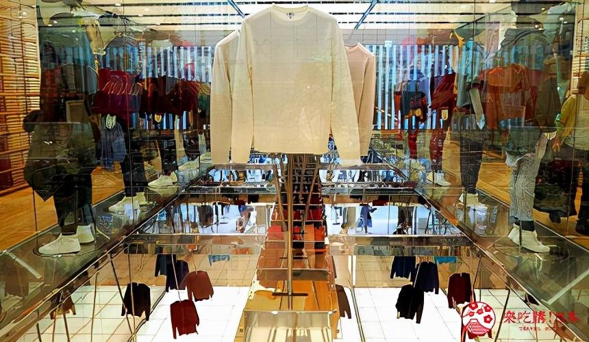 另一区「LifeWear INSTALLATION」艺术装置区,从透明橱窗中俯视结合1、2楼的动态服装展示,以及随性穿搭出艺术感的人体模特儿,让UNIQLO多了时尚气息。