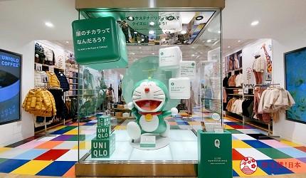 绿色哆啦A梦是UNIQLO的旧衣回收大使,在充满童心的7楼童装区可以看到满满的绿色哆啦A梦身影。电扶梯入口处还设计了动态互动区,可以实际按按钮,看UNIQLO如何将回收的宝特瓶,转变成再生纤维,再变成穿在身上的衣服。整层楼有4种不同表情的哆啦A梦出没,粉丝们一定要来这边拍照纪念!