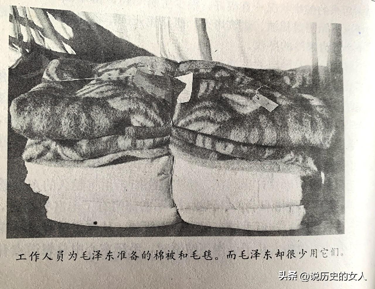 比如有一次毛主席去重庆,当地的同志给主席安排的卧室里准备了一条绸缎被子,主席晚上看到后,很不喜欢,吩咐卫士撤走那条新被子,拿出自己带的旧毛巾被盖着睡觉。
