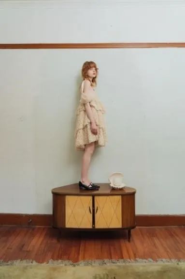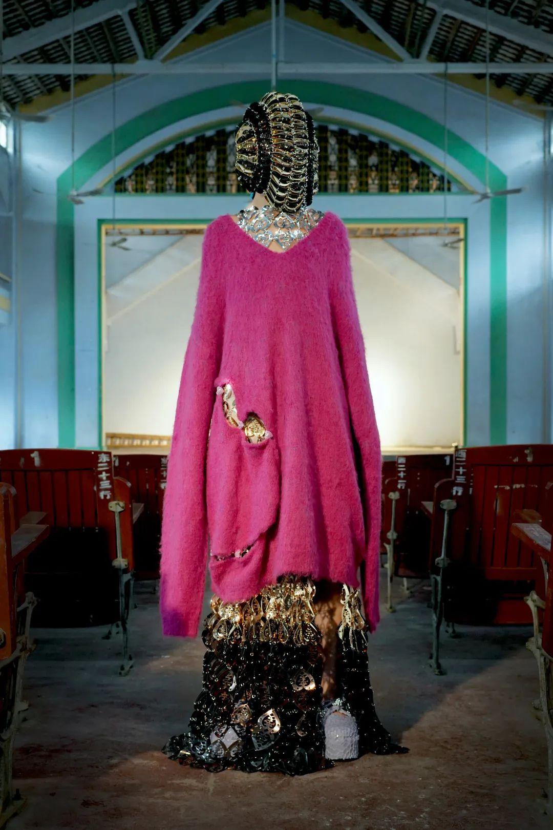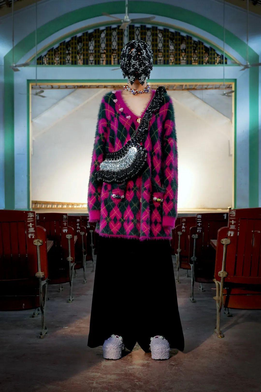 在这一系列中,每一件单品依旧承载着丰富的故事和情绪。这一系列的法则是为婚礼或日常工作中融入YUEQI QI细节的高定和成衣系列。因此悬浮爱心图案既嵌在宽松毛衣上,也雕刻于定制服装中,由陶瓷串珠和别针串起。陶瓷爱心的再次登场也代表着戚玥琪一直坚持对中国千年历史的手工艺致敬。