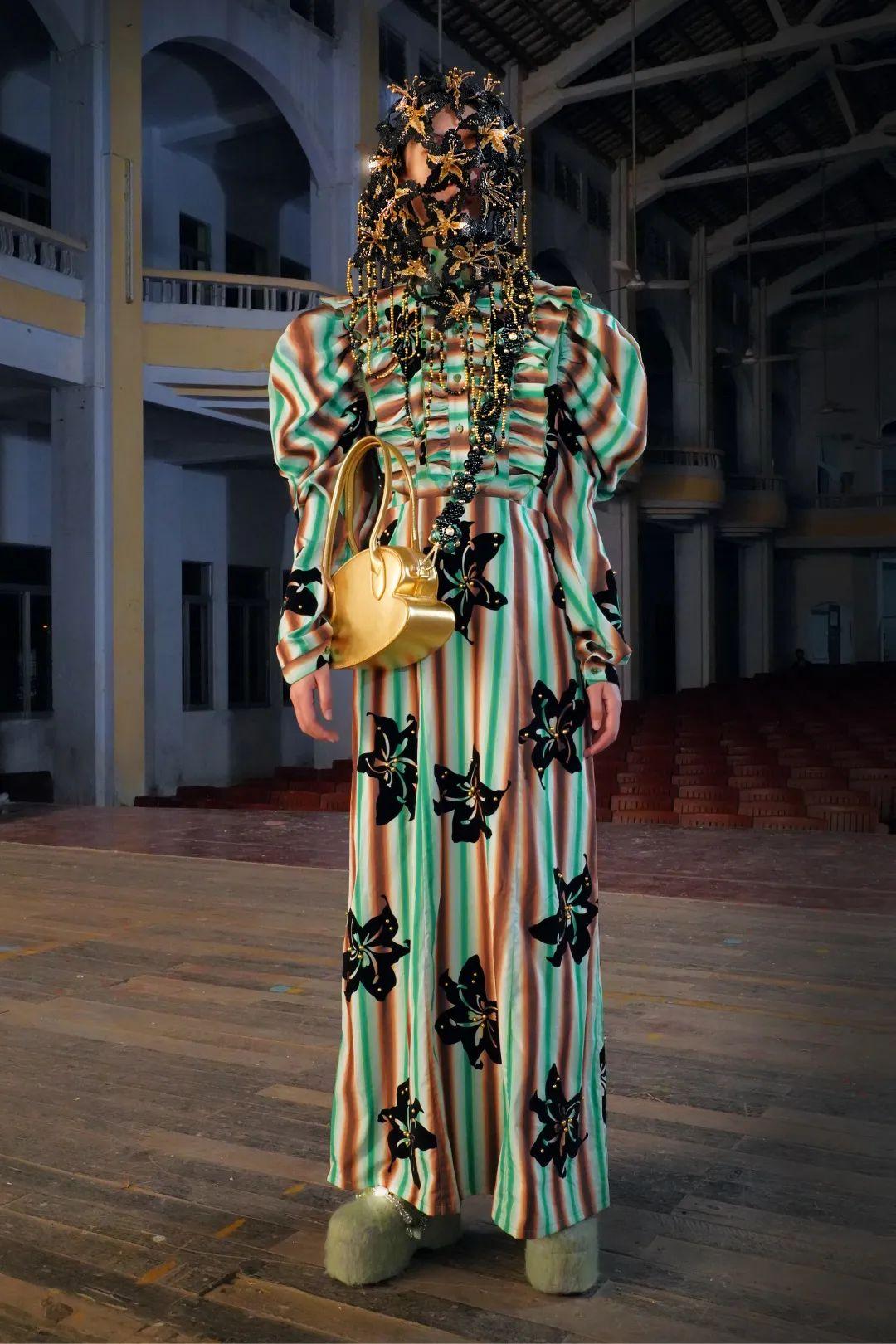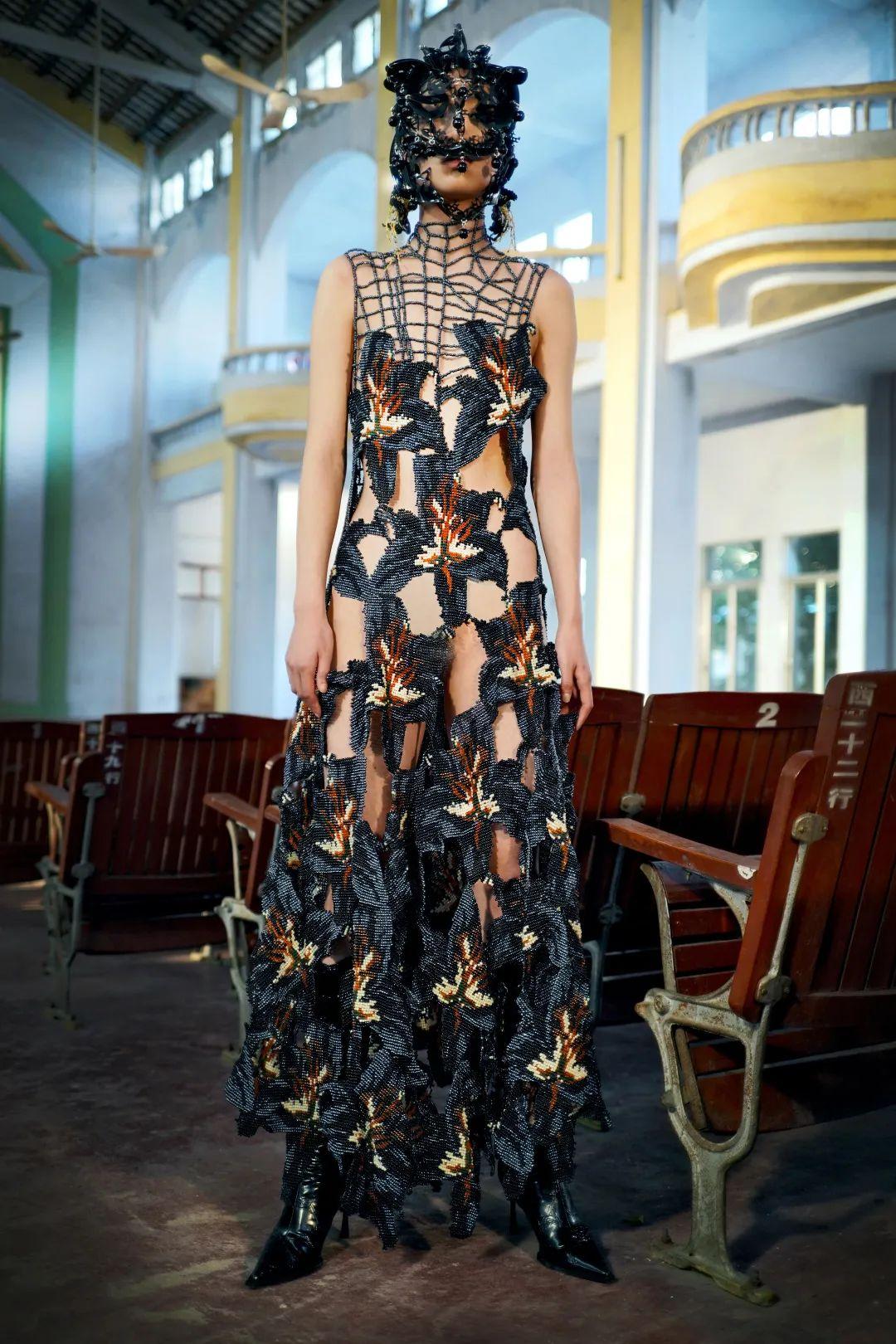 YUEQI QI AW22 系列吹响了现代女性的号角。面对着台下愚昧观众的审视,女主人公坚定而优雅地站立着。就如同这一系列中反复出现的由串珠和印花编织而成的复仇之花——黑百合,看似冰冷的躯体之下流淌着喷薄的血液。舞台上灯光亮起,将我们拉扯到那个粉红电影和钱德勒式侦探小说里呈现的世界。