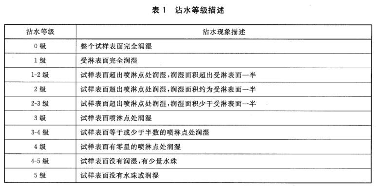 表面抗湿性根据我国的《户外运动服装 冲锋衣》标准,Ⅰ级面料的洗前表面抗湿性应达到4级,洗后应达到3级,Ⅱ级面料洗前为4级,洗后不考核。