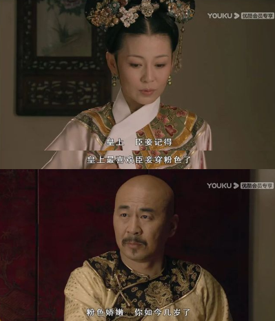 但红色其实是一个广的概念,比如粉红就也是红色,但大妈们却少有身穿粉衣的,都偏爱饱和度较高的红,尤其是紫红。毕竟年龄摆在这儿,浅粉色有点违和感。硬要上身,可能会和《甄嬛传》中的齐妃一样,获得一句: