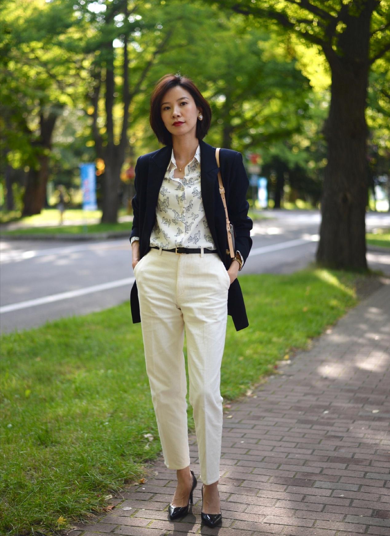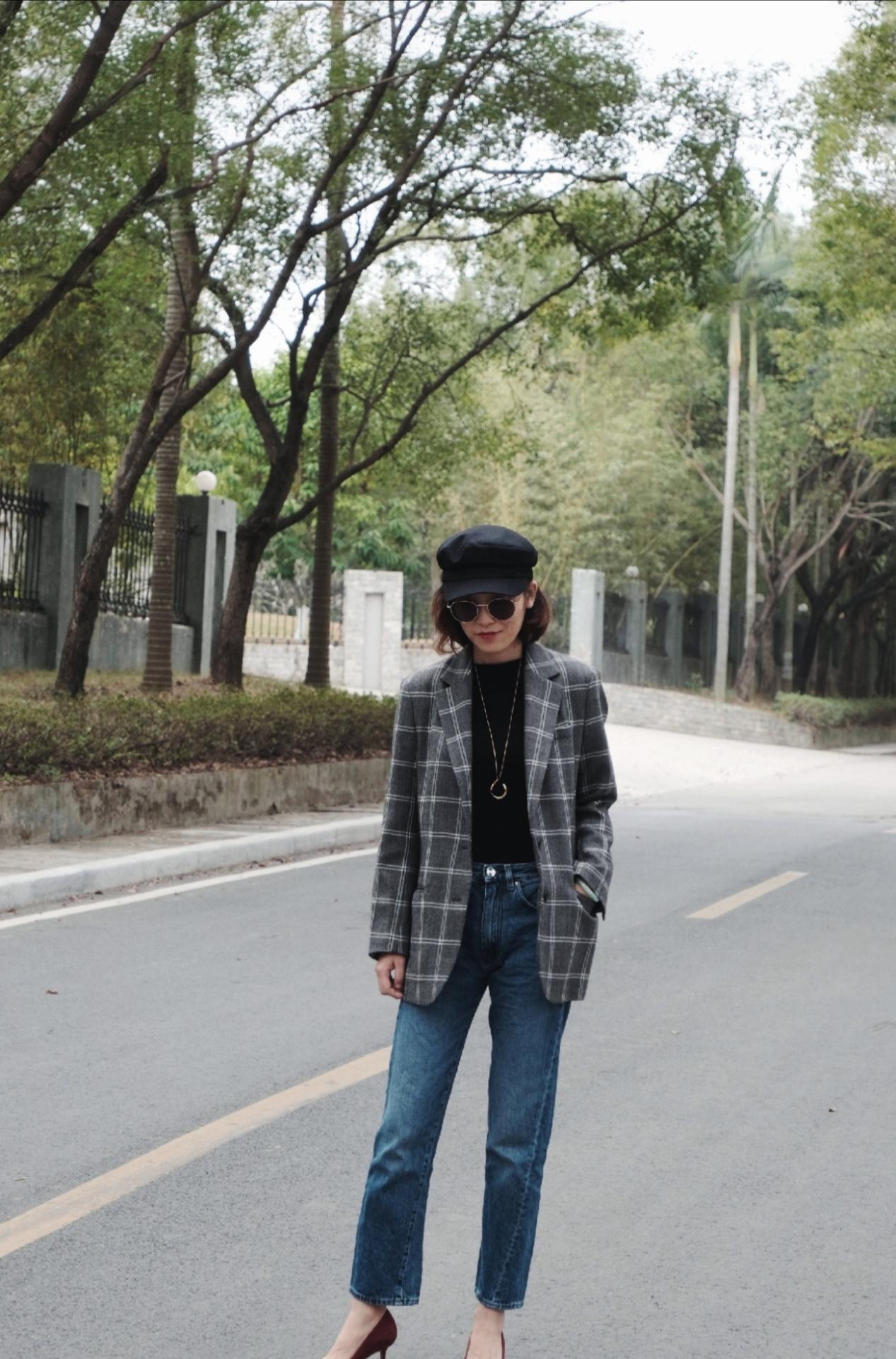 虽然格纹西装很流行,但纯色的西装依旧处于时尚圈的顶端。选择藏青色的小西装能够让女性散发出十足的魅力,内搭一件白色的印花衬衫来减淡深色的服装所带来的厚重的感觉,营造出一丝欢快的气息,也让个人的风格更加多变。