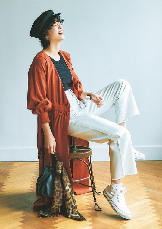 一些年龄稍长的女性在搭配服装时,往往会陷入一个误区,那就是经常用黑色来装点自己,认为这是一种不会出错的穿衣方式。其实总是穿黑色或是经典的色系,自然不会给个人的穿搭“拖后腿”,但难免看久了会觉得腻味。这时可以选择一些其他的色系来丰富自己的衣橱。可以用一款暗橘色的长外套来穿出韵味,内搭一件黑色的T恤。下半身穿上白色的直筒裤,整体的色彩依旧是经典的类型,也不会太过老气横秋。