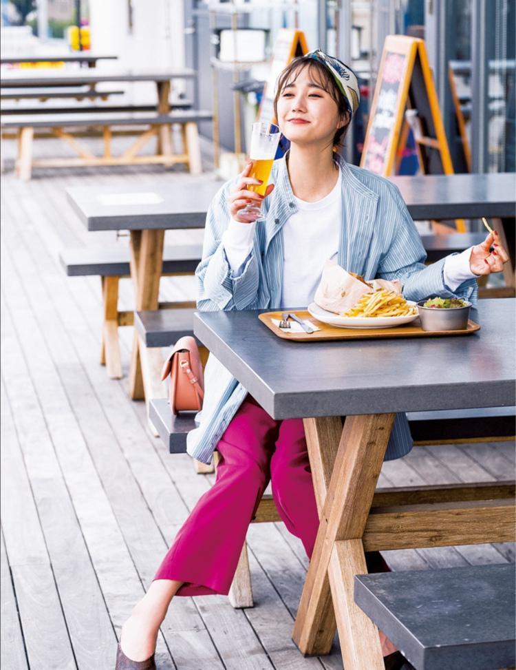 时尚女性的衣柜里不会总是清一色的黑白灰,她们会将各种色彩形成一个平衡,根据自己的服装风格巧妙的进行搭配。如果在春季想要悠闲的出门逛街的话,那么就适合休闲风的穿着打扮。可以用一款竖条纹的衬衫搭配白色的圆领T恤,这种穿衣方式简洁又很显气质。加上一些竖条纹的元素,更是轻松显瘦的一个小妙招。而下半身可以选择一款亮色系的单品,也就是图中的这款紫红色的直筒裤来俘获人们的视觉,保持了十足的质感,还能够凸显出色彩搭配上的高级范儿。