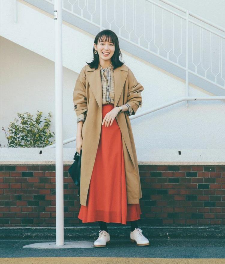 春季穿上一款卡其色的外套,也能够优雅又显气质,长款的样式无形之中增添了些许风度,敞开穿则更显自然和从容的气质。可以在里面搭配一款格纹类型的衬衫,在色彩的选择上,可以用卡其色为主色。下半身则穿上一款橘色的半身裙,点亮视觉,增添活力气质。