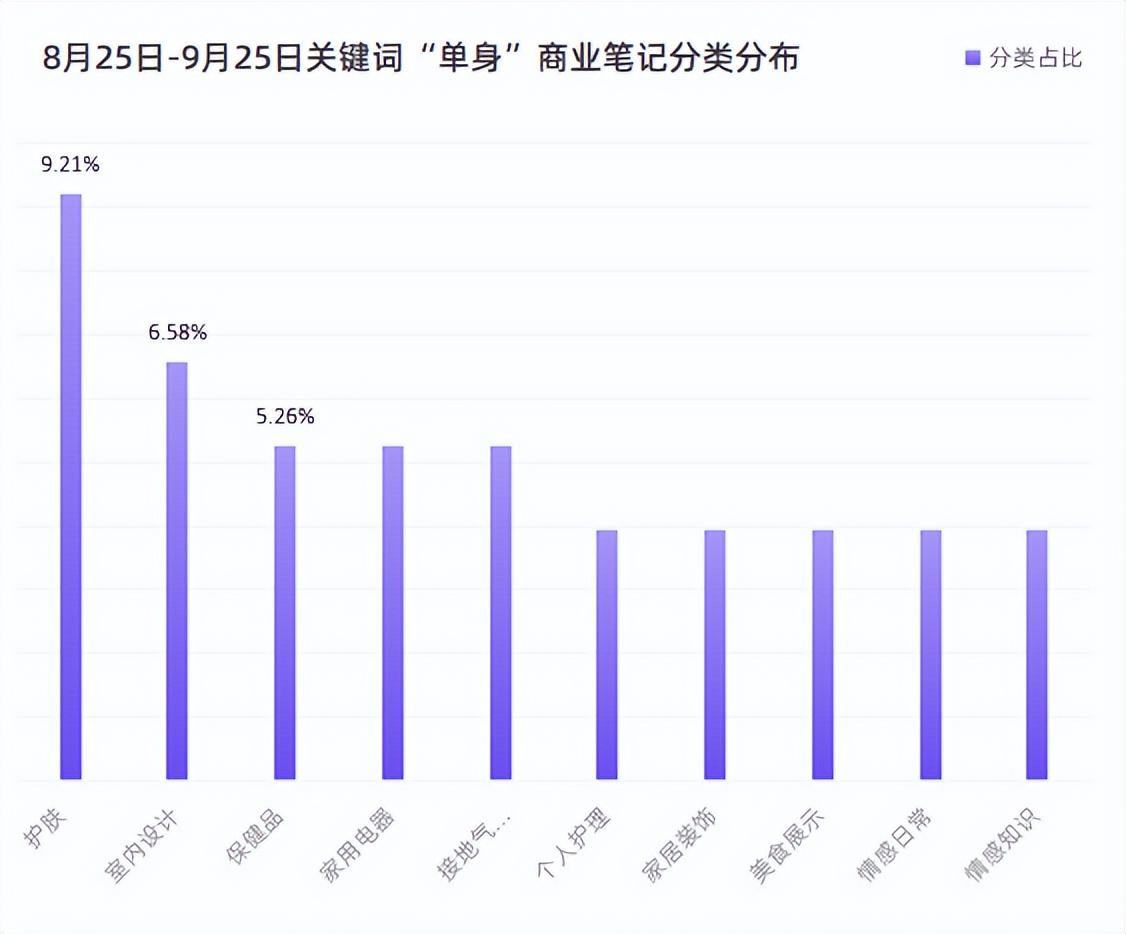 相对而言,一二线城市的单身率更高。果集·千瓜数据显示:8月25日-9月25日关键词“单身”商业笔记分类分布呈现多样化,设计护肤、室内设计、保健品、家用电器、美食等。相对于学生党、职场人、年轻妈妈,单身贵族的关注焦点更加。