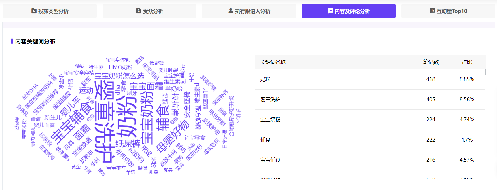 婴童食品分类笔记针对性强,比如这篇商业笔记《10M+宝宝快手辅食 | 一周元气早餐不重样》,就是面向10个月以上宝宝的辅食。互动量TOP100的婴童食品类商业笔记中,标题关键词出现品类词“辅食”的占比33%,出现品类词“奶粉”的占比12%。