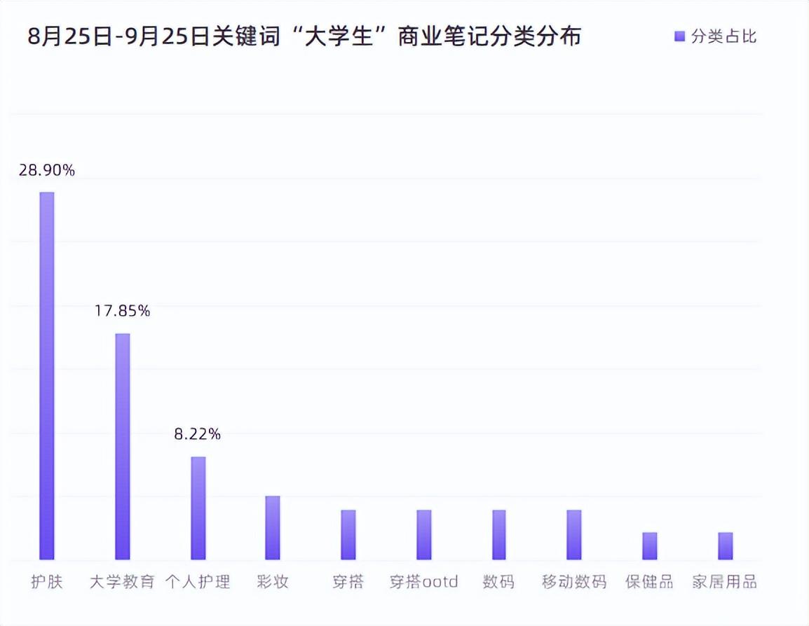 8月25日-9月25日果集·千瓜数据显示:关键词“大学生”相关商业笔记占比中,护肤、大学教育、个人护理位居前三,学生党重视教育、更加重视皮肤养护问题。