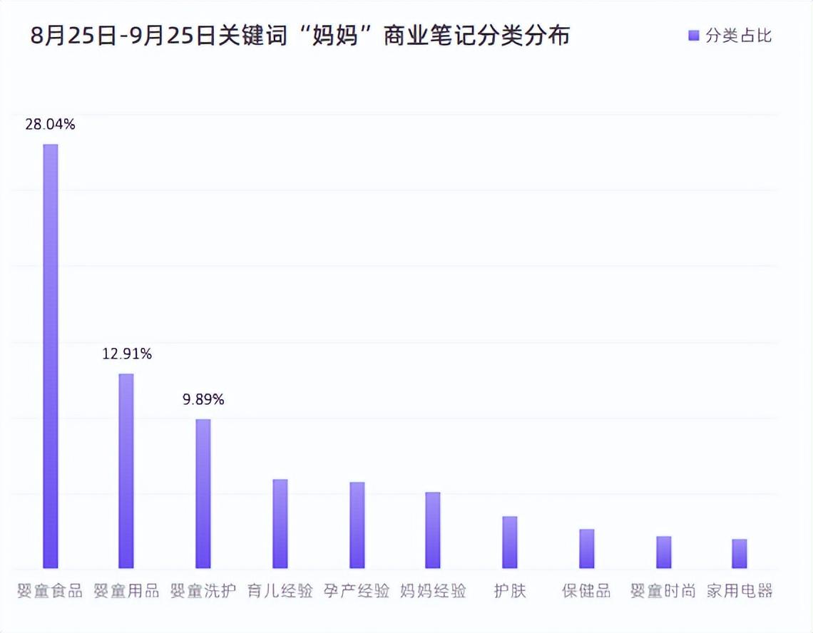 8月25日-9月25日“妈妈”婴童食品、婴童用品、婴童洗护3大分类商业笔记显示:品牌方更倾向于品类词触达用户,前5的关键词多为品类词“奶粉”、“辅食”等。第一次当妈妈的用户更多,且更倾向于通过搜索场景获得相关信息。
