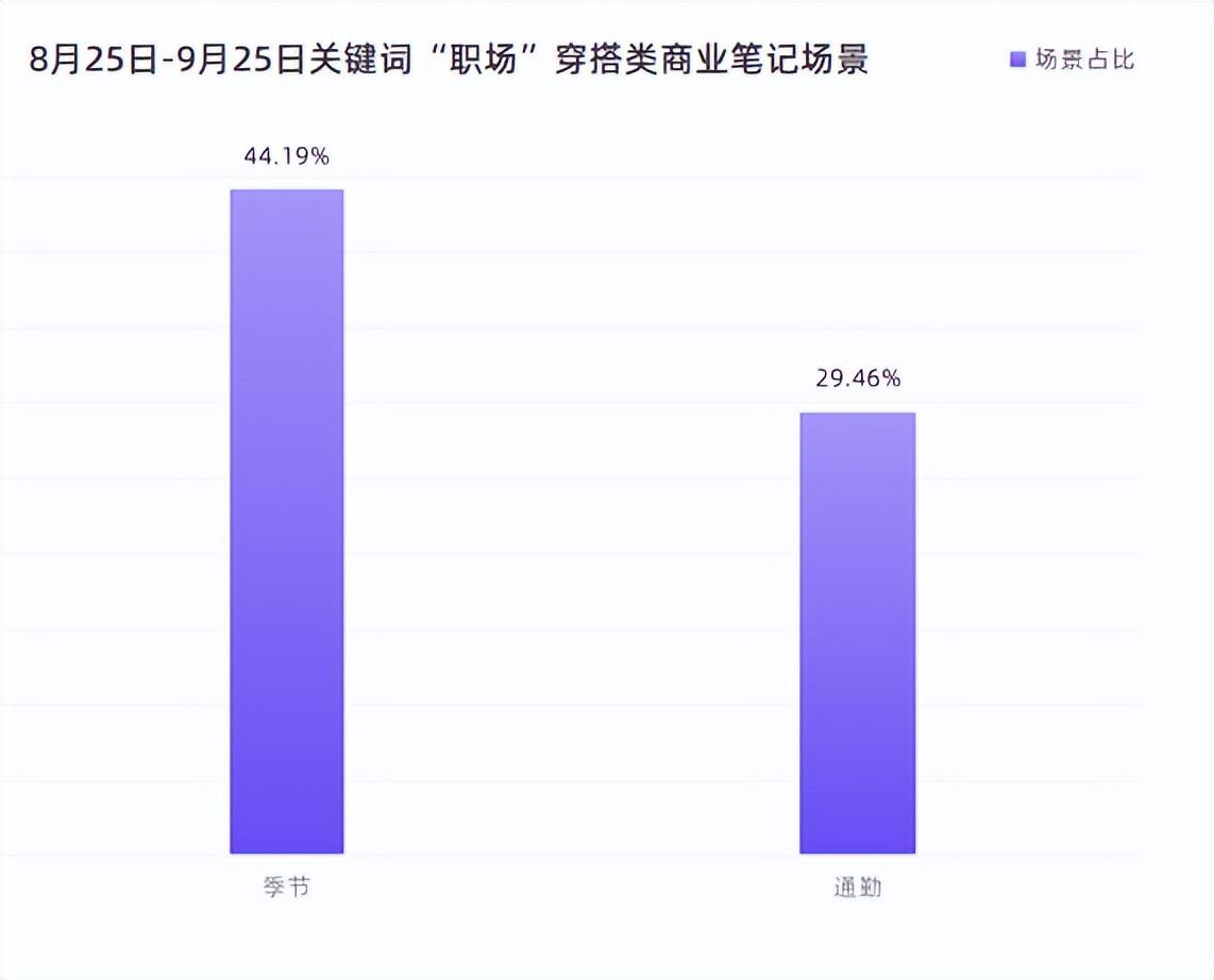 场景需求主要是集中季节和通勤上,早秋、秋季、秋天等标题占比44.19%,远远超过其他场景。其次是通勤占比29.46%,细分需求集中在舒适、极简、懒人、日常、高级感、百搭等。