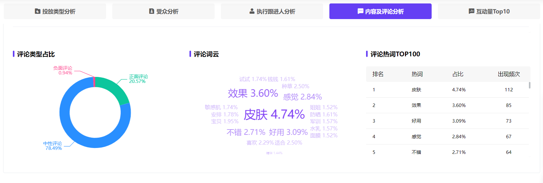 8月25日-9月25日“大学生”护肤分类商业笔记显示:学生党普遍围绕核心关键词“皮肤”展开讨论,关心产品“果”,使用体验词出现在前列,“好用”、“不错”等,认可度较高。另外,“素颜”关键词占比1.06%,也是大学生的重要需求场景,素颜霜受到学生党喜爱。