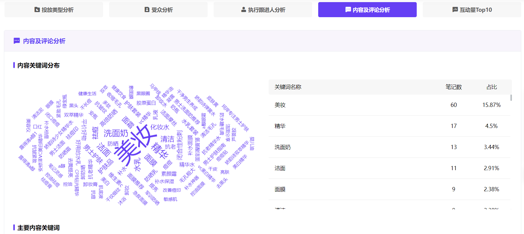 8月25日-9月25日“大学生”护肤分类商业笔记显示:内容关键词主要集中在品类词:美妆、精华、洗面奶等。占比超过1%的需求关键词包括祛痘、防晒、抗老等。