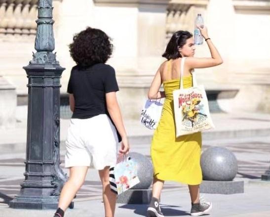 7月13日,在法国巴黎卢浮宫博物馆玻璃金字塔广场上,一名女子把冰镇矿泉水贴在额头上解暑。图源:新华社