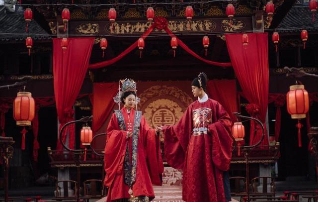 隋唐与宋到隋唐时期,前面的婚服基本都一渐渐淡出历史舞台,加上生活水平的提高,染织行业都有了很大的进步,“红男绿女”开始出现,男子身着绛色公服,女子穿戴青绿色礼服。