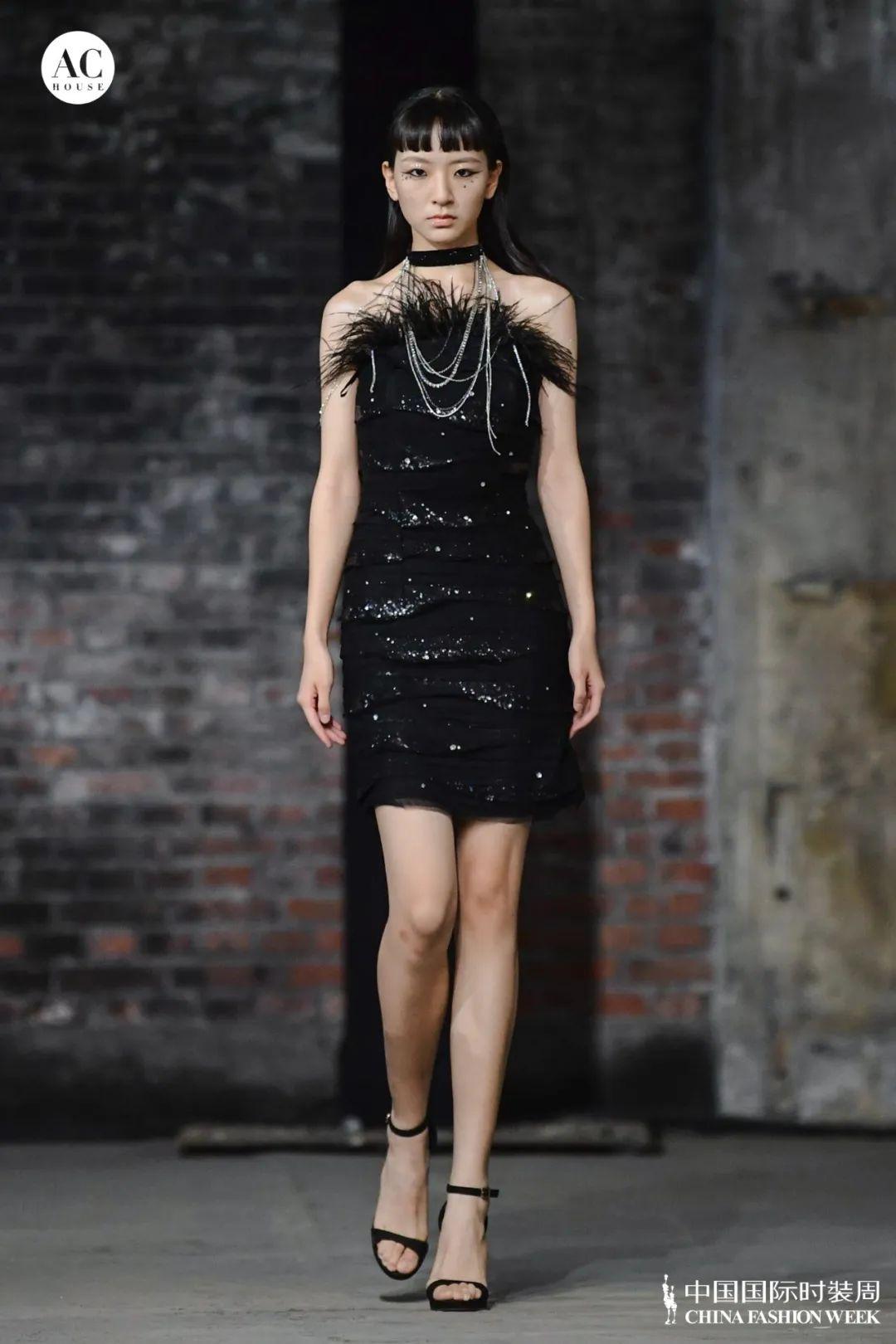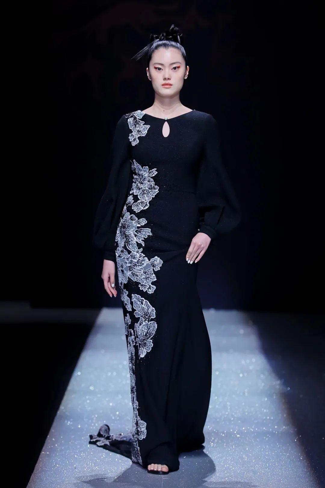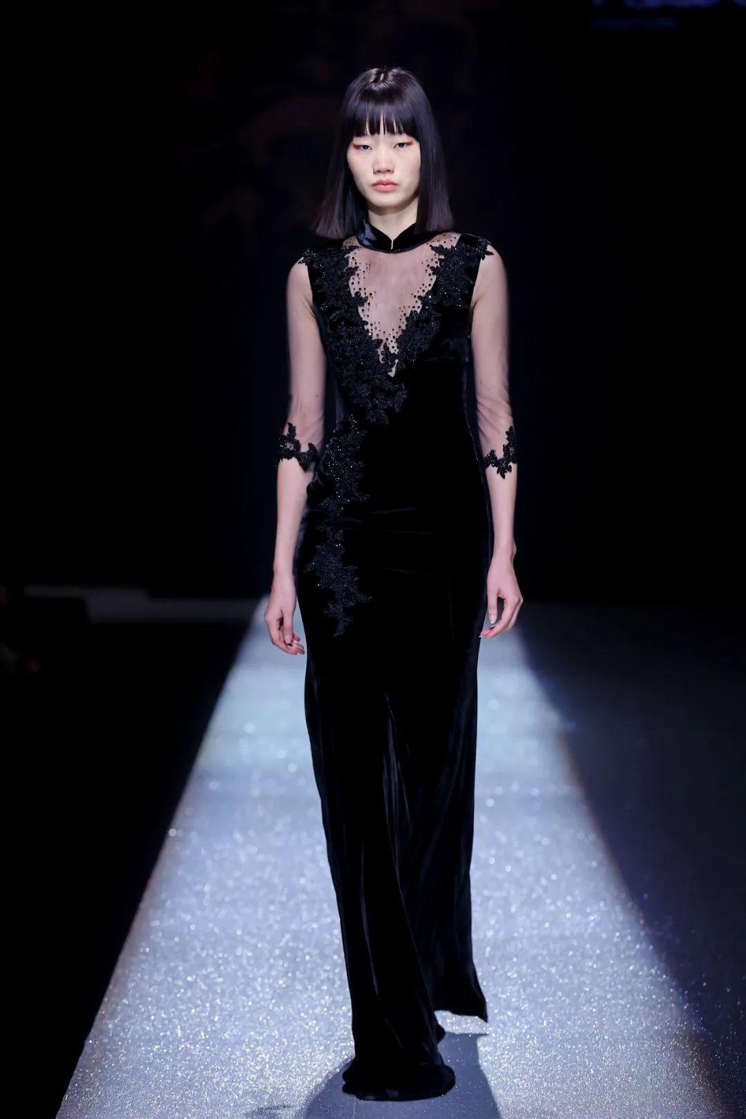 裙子质地轻盈,黑纱之下将重工法式刺绣与新中式轻奢礼服的结合,展现传统与现代的融合之美,高级又性感。
