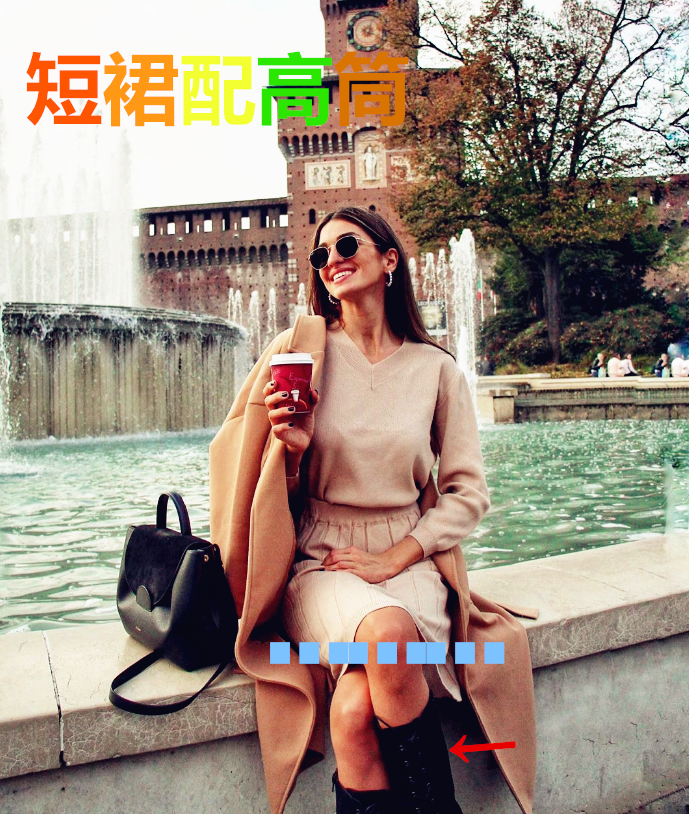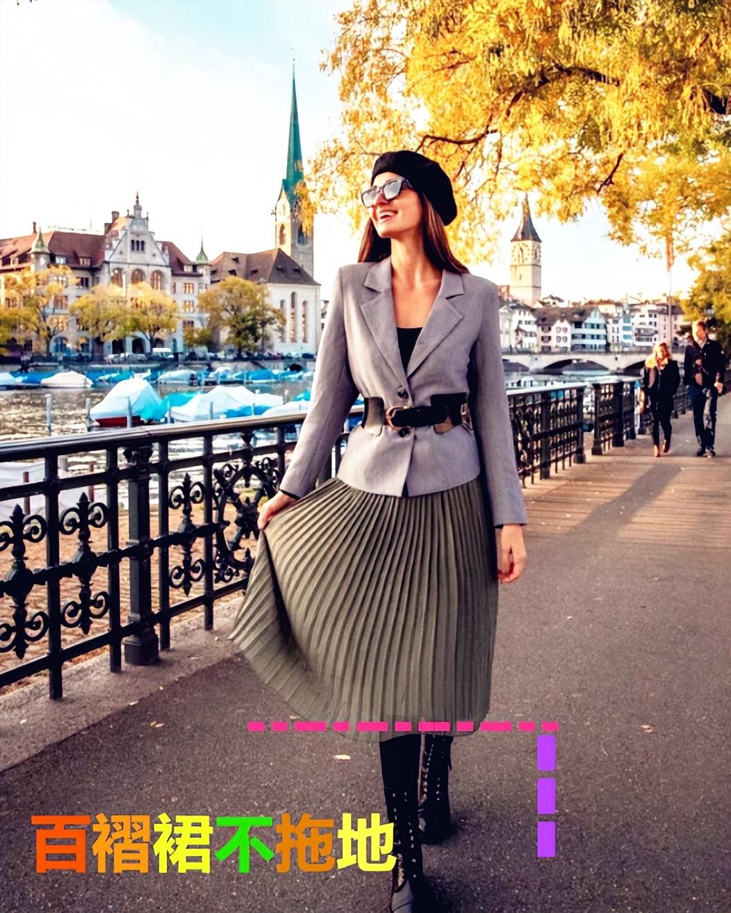 如果短款的百褶裙,突出脚踝的长度,或者采用高筒靴来打造高挑身型,都是可以的。