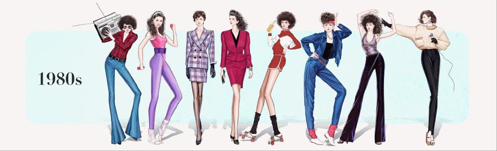 紧身衣、垫肩大西服、牛仔喇叭裤、职业套装、超短裙、爆炸头、录音机......丰富的流行元素、各色各样的潮流风格,正在一 一上演,我们的时尚和西方接轨。