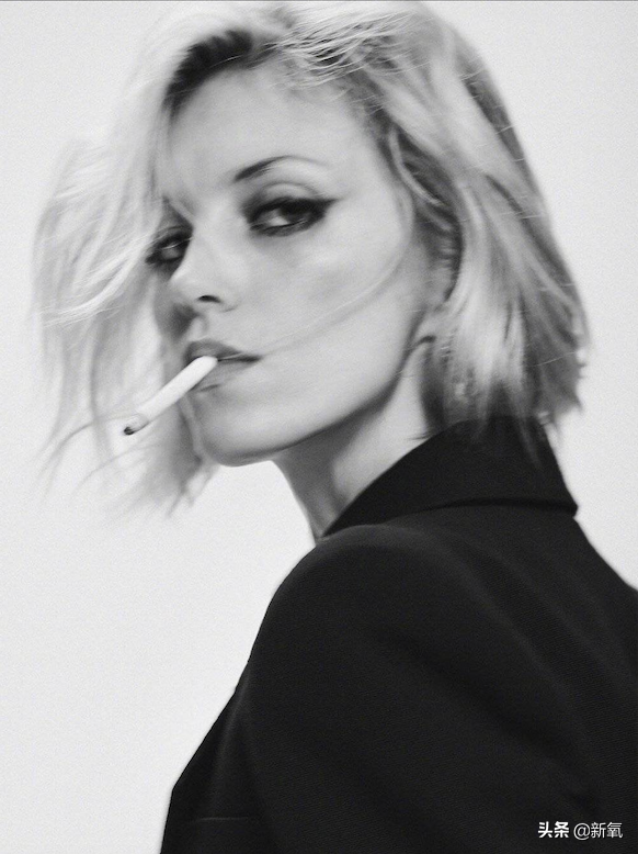 她的脸比身材更瘦,骨感极强。方块感极强的额头,高耸的颧骨,毫不含蓄的鼻梁,配上眼裂极大的下三白巨眼。冷酷、时髦、华丽、颓废的风格都走向了。