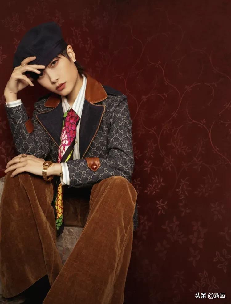 同理,瘦方脸、长中庭、留白感强的李宇春在硬照时也能用脸部的退让与Gucci时装和谐。
