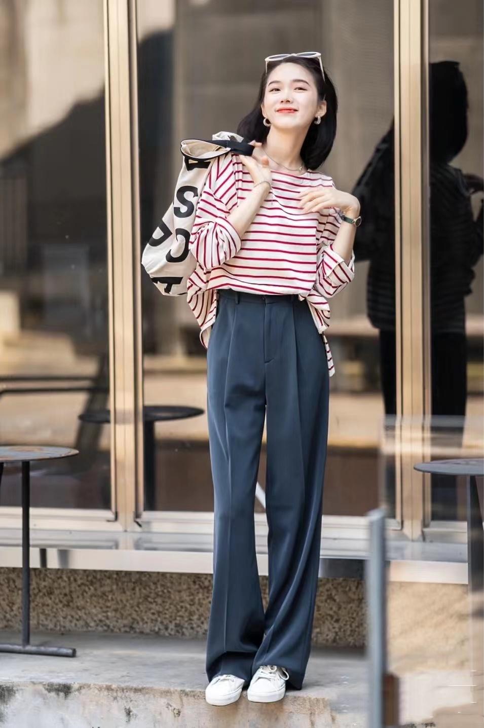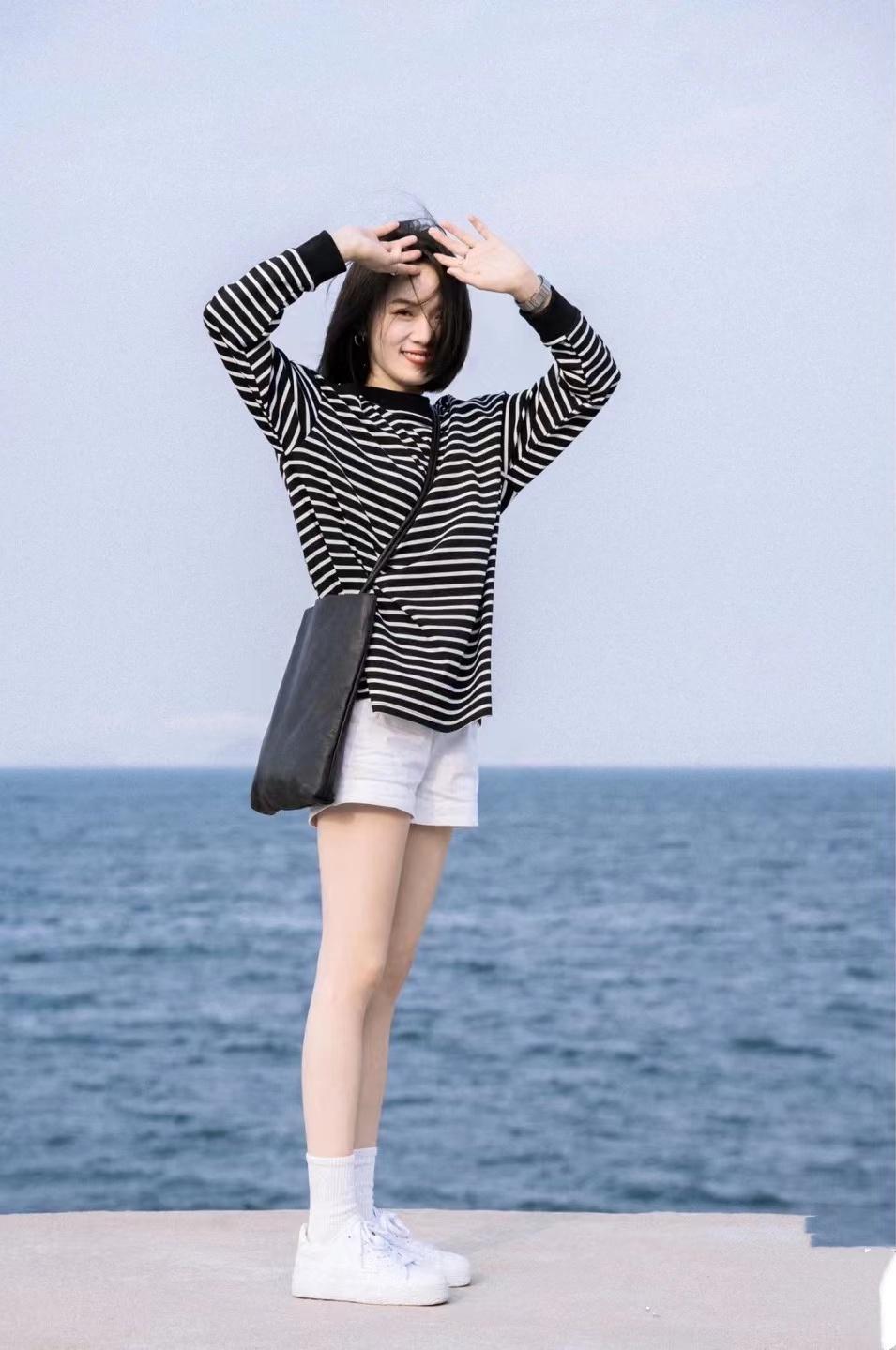 谁说横向的条纹会显胖?其实线条相对紧密的横向条纹一点都不显胖。尤其是黑色底色的条纹T恤,完全没有臃肿显胖的可能,反而衬托出一种纸片人的果。经典的条纹T恤,在春夏的季节也是特别受欢迎的。