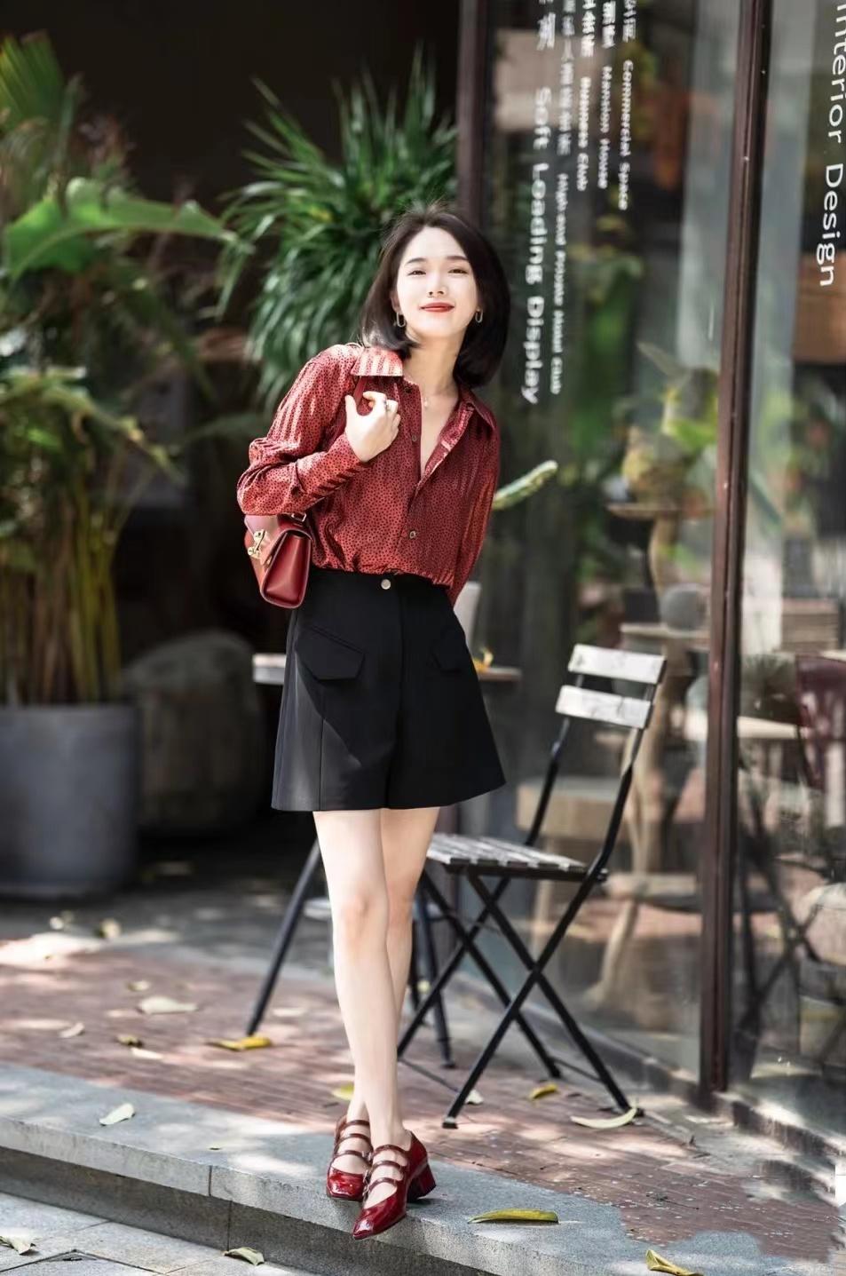 酒红色的丝绒衬衫,洋溢着复古华贵的美感,对于三四十岁的女人来讲,这种衬衫可以凸显气质,表达内敛含蓄之美。双脚搭配了同色系的复古风小皮鞋,精致复古的女人味不言而喻,每一个细节都分外考究。