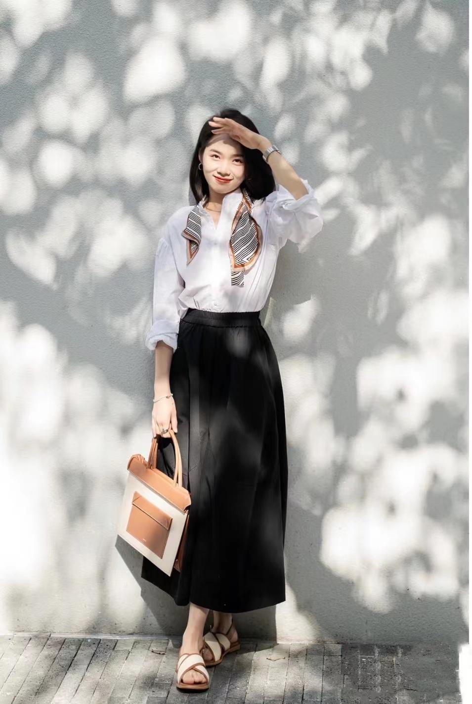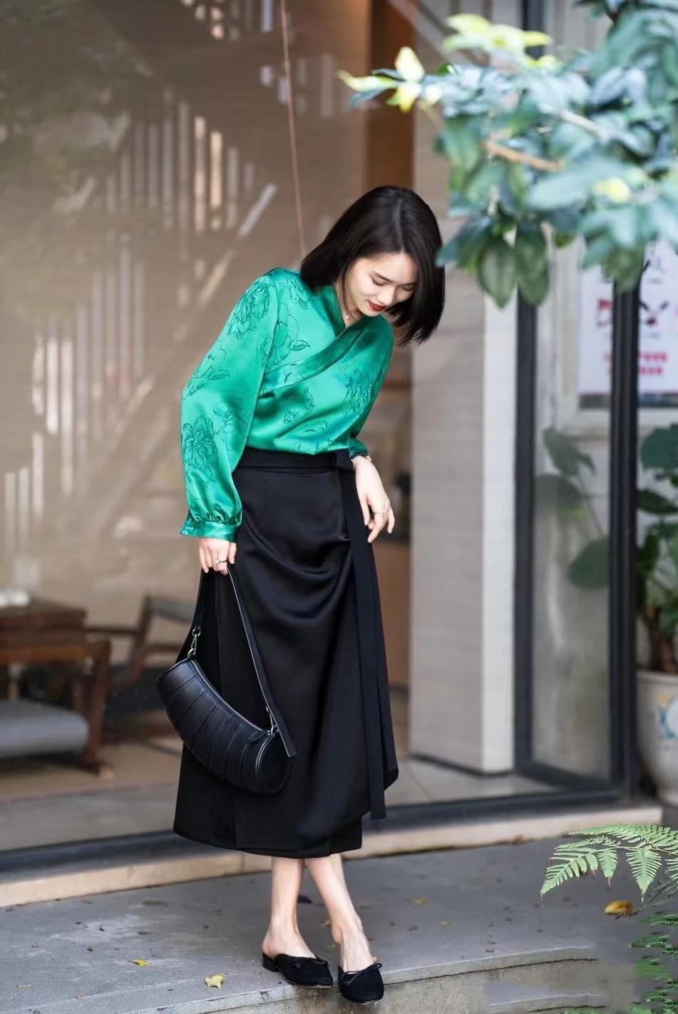 缎面提花的衬衫,是一种优雅显贵的单品。服装搭配上更加从容一些,配上高腰的长款半裙,就是优雅又浪漫的模样。