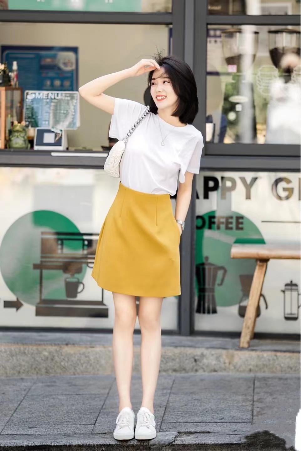 想要自己的气质更加出挑一些,可以组合亮色系的下装来穿着。明黄色的A字型半裙,流场的剪裁修饰腰身,可以掩盖一些身体的小瑕疵。组合平底的小白鞋,清爽又甜美,自然地削弱了年龄感。